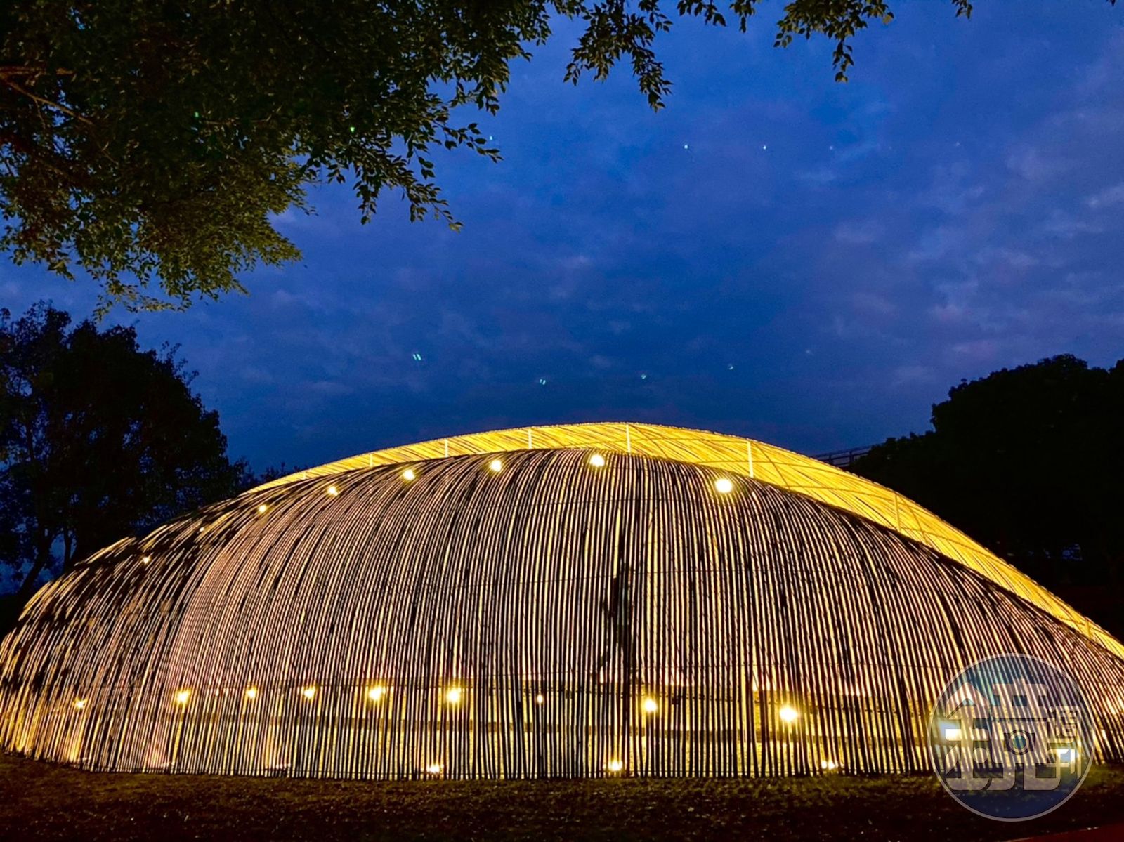 《拾光》運用竹、木、鐵,在地面上創作一個從地面隆起並被光痕交疊的種子造型,讓遊客進入光痕包覆的神秘空間。(台南市觀光旅遊局提供)2021月津港燈節以「魔幻・拾光」為策展主題,構想從來自太陽的魔幻時刻到專屬月津港月光的「魔幻拾光」,「拾」代表的是月津港燈節的10年,也同時象徵將歲月重新拾起。