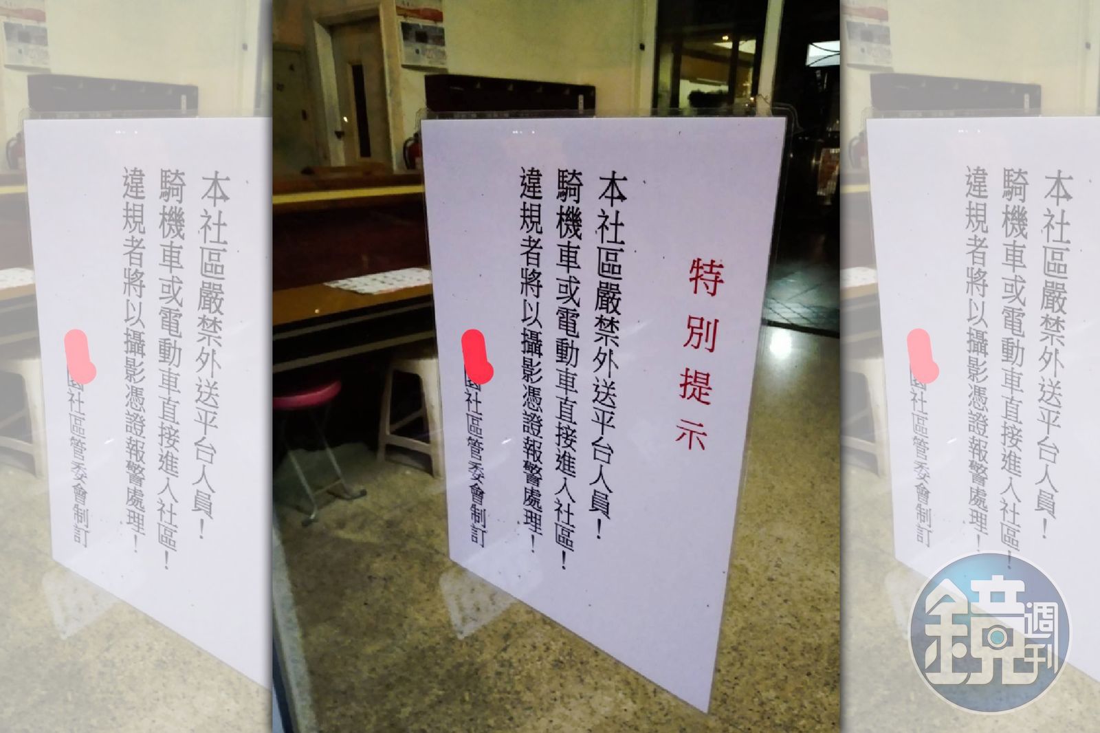 一名外送員26日在臉書社團「外送員的奇聞怪事」發文指出,他第一次送餐到某社區,快到時打電話給客人,接通後對方告知他直接騎進來社區送餐,但他卻在社區門口看到一張公告,上面寫著「嚴禁外送員騎車直接進社區送餐,違者將攝影舉發報警處理」。