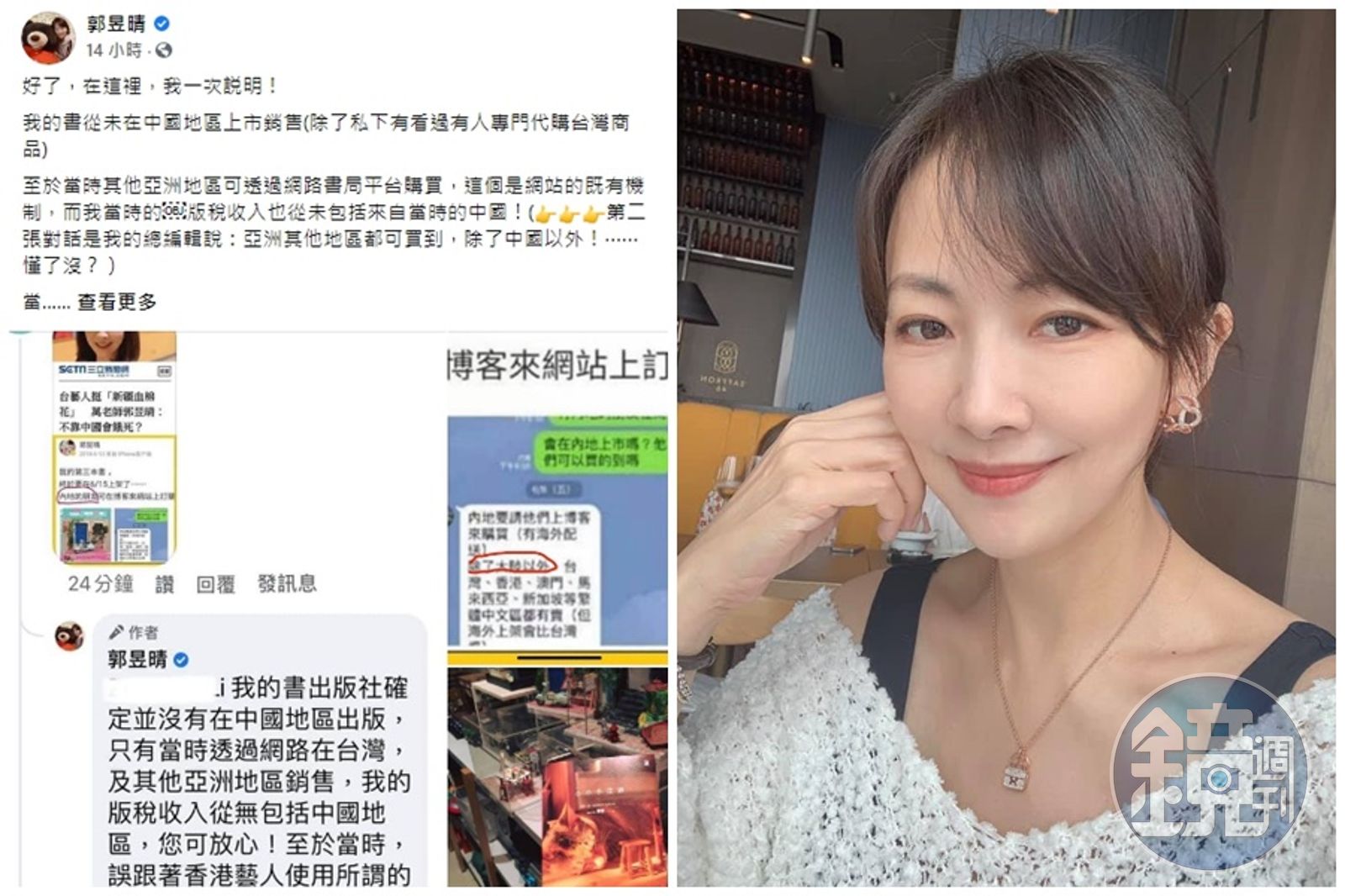郭昱晴表示,當時她的書在其他亞洲地區可透過網路書局平台購買,是該網站的既有機制,「而我當時的版稅收入也從未包括來自當時的中國!」並PO出對話重點強調「亞洲其他地區都可買到,除了中國以外」,她還說「我知道人民幣香但目前為止真的沒聞過!」