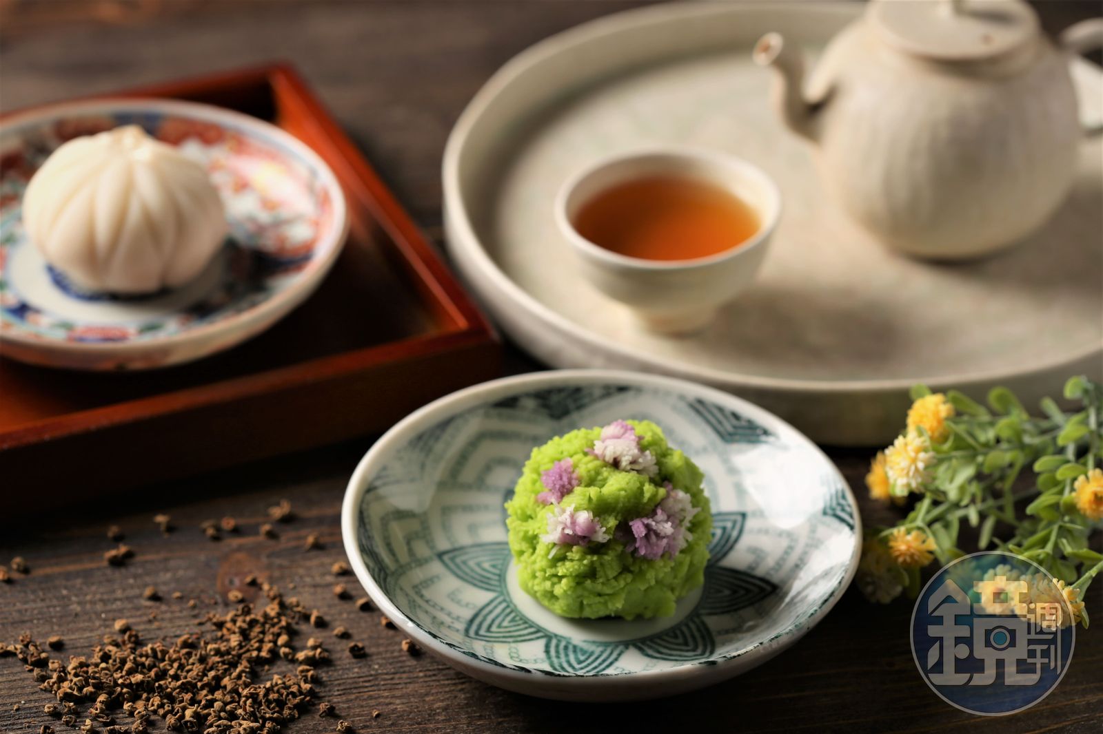除了選茶可稍稍看出個性,茶食也可看出陳衣安的細膩。原先有點害怕時令甜點中的「特製和菓子」,畢竟「很甜」就是和菓子給人的既定印象。但陳衣安挑選以春天草地為設計的和菓子中,融入野薑花糖漿,香氣隱隱散出;另一款花瓣造型的和菓子內餡揉合蜂蜜與豆沙,甜度不僅意外的偏低,吃起來竟然有粉粉的蛋黃口感,搭配來自彰化、口感清雅的龍眼花茶,是令人驚喜的台日協奏曲。