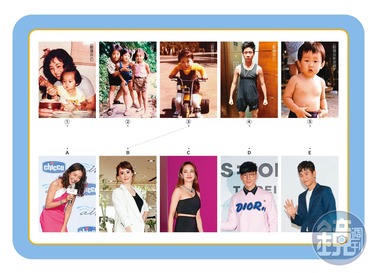 ①被蔡依林的媽媽(?)抱著好幸福!長大後專剋小三「回不去了」!(翻攝自IG)②右邊女孩每段感情都談得轟轟烈烈,未因「新疆棉事件」切割代言超霸氣。(翻攝自IG)③人生勝利組的代表,每段感情也都轟轟烈烈,結婚後連生1女2子。(翻攝自IG)④不要笑人家「中二」矬樣,長大後秒變情聖,會創作還會唱歌,帥到以後別做朋友。(翻攝自IG)⑤不要笑人家呆呆的矬樣,長大後秒變情聖,會創作還會唱歌…咦?怎麼跟④號一樣?(翻攝自新浪網)解答︰①=A=隋棠;②= C=蔡依林;③=B=關穎;④=E=周興哲;⑤=D=林俊傑。