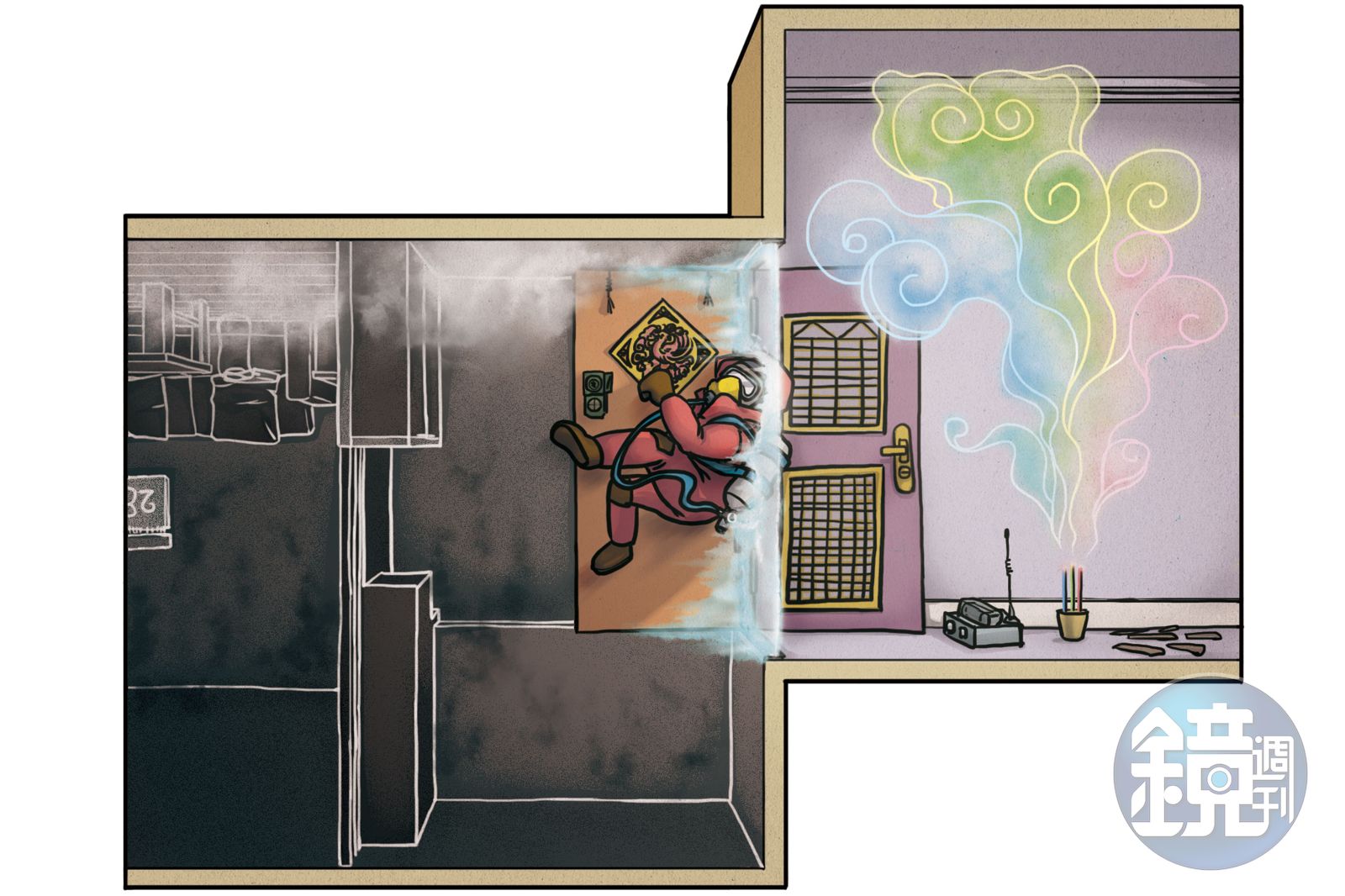 身體恢復平衡後,他打亮一根螢光棒,用背膠貼在入口門板上。接著抬頭看向天花板,一縷藍色煙霧從天花板門縫緩緩流洩進來,這抹藍是這空間裡的唯一亮眼顏色,也兼具倒數計時的功能。