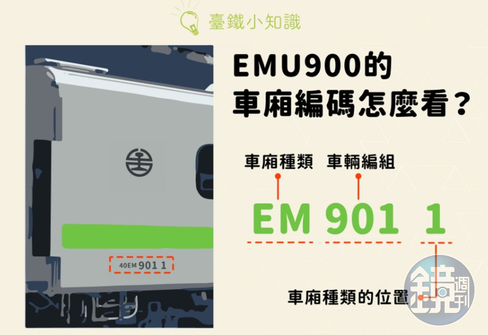 「fun台鐵」表示, 以車廂編碼「EM9011」舉例,其中的英文代表不同的「車廂種類」,EMU900由「10輛車廂組成1編組」,分別為2個駕駛車廂(ED)、5個動力車廂(EM)、3個電力車廂(EP車廂)。