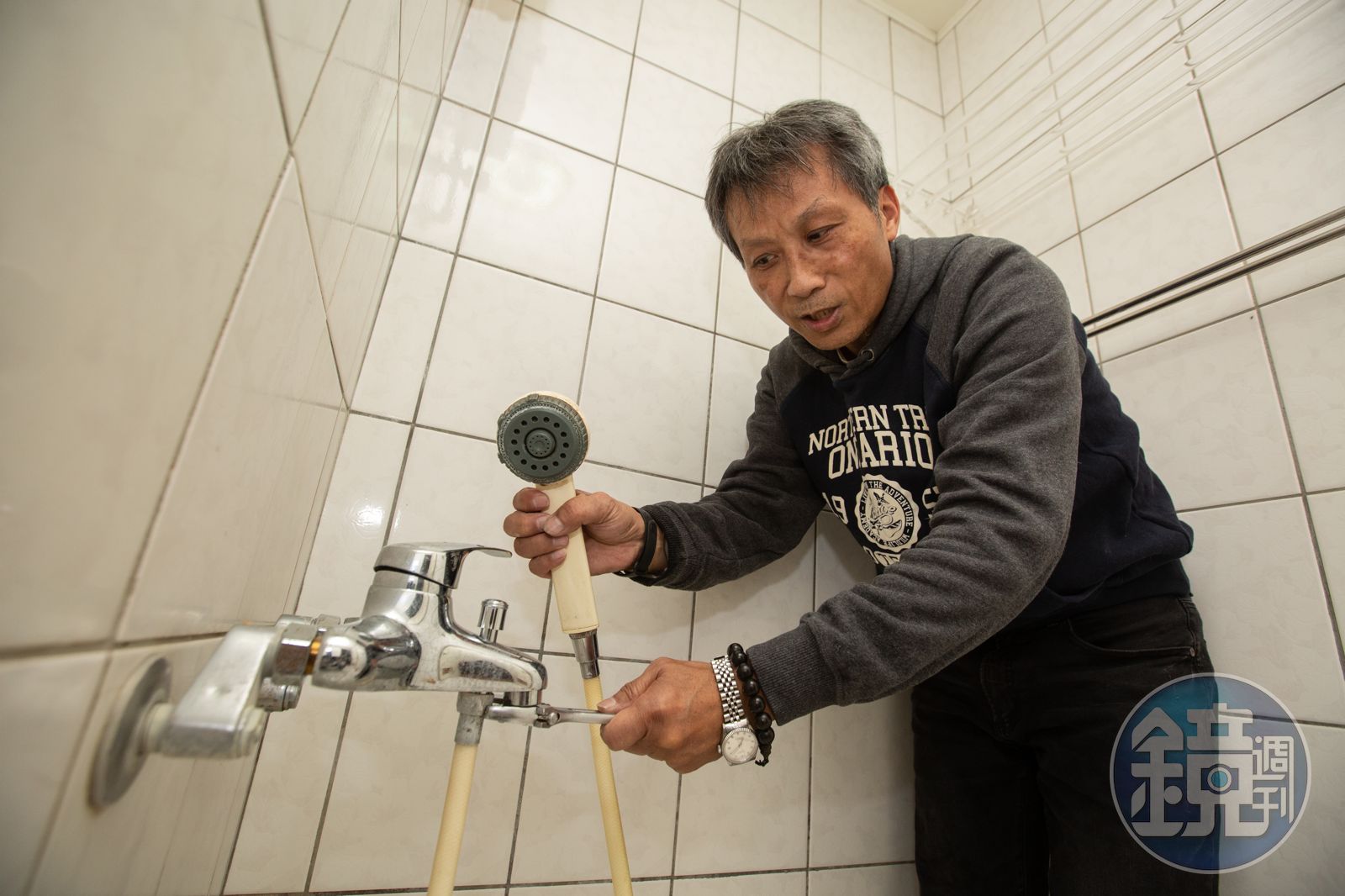 除了家裡耗水量最大的馬桶之外,鄭瑞章也勤查小細節,他手拿老虎鉗,轉開水龍頭口的節水墊片說:「髒垢會影響出水,誤以為水流不夠、越開越大,形成浪費。」在他眼裡,水龍頭每秒漏1滴,1天就流掉24公升,他謹慎防止水龍頭漏水,也會適當調整下方的冷熱水水壓(左熱水、右冷水,順時針轉水量小、逆時針轉水量大)。