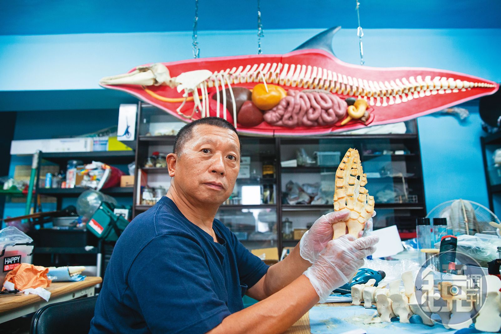 沒有擱淺通報的另一天,我們來到處理鯨豚標本的工作室。死亡鯨豚的肉體組織在細菌作用下分解,腐爛的氣味滲入鼻腔,我光嗅聞一塊經去味處理的海豚頭部骨骸,就被嗆得作嘔,郭祥廈卻能安然坐定,一雙厚實大手握著小刀,細細清除骨骸上的腐肉。「髒的臭的,總是有人要做嘛。」總結自己的工作,他呵呵笑,渾厚嗓音在身後懸掛的鯨豚標本間繚繞。