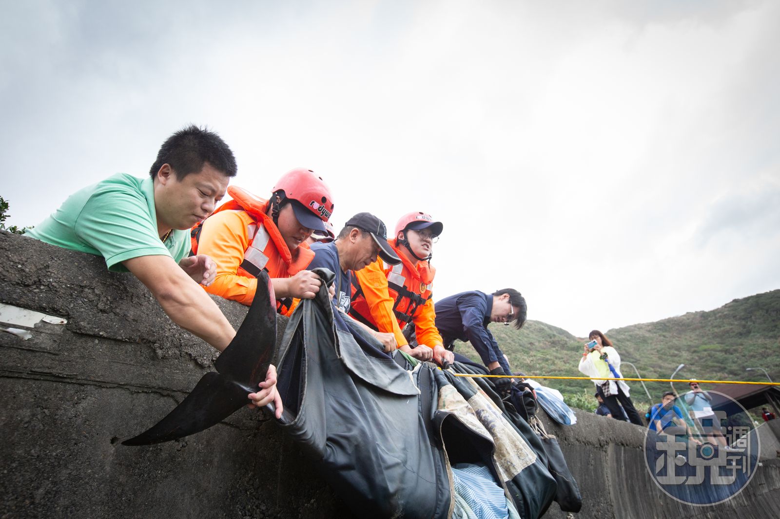去年10月17日,又有2隻瓜頭鯨在林口海岸擱淺,後被送往苗栗崎頂的救援池。2天後,我來到救援池邊,5公尺長的池子裡,2隻瓜頭鯨在水面靜止不動,看起來膽怯又疲憊,郭祥廈站在池中以毛巾固定鯨身、讓牠抬頭呼吸。離開池子,他悄聲告訴我,2隻鯨血液檢查正常,若無意外,最快3天後可野放。