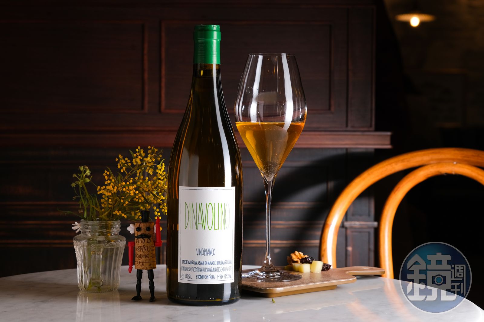 我覺得來璞斟可以跟珍惜的人好好說話,因為Emma眼光很好,她不只挑選義大利、法國、西班牙舊世界的紅白酒,同時也有為數不少的自然派葡萄酒,甚至最潮的橘酒也能喝單杯。我喝到由義大利橘酒大師Giulio Armani擔任莊主、只生產橘酒的「狄娜沃羅酒莊」出品的「狄娜沃利諾橘酒」,酒色明亮橘黃,香氣豐盈,在杏桃之外,也有月桂葉、百里香,還沒等嘴裡的酒液下到喉嚨,立刻想再來一口,不是因為口渴,而是酒感有厚度又順口,幸好有飽滿肉餡的「私房韭菜和蝦仁餃子」,讓我配速,以免太快乾杯。