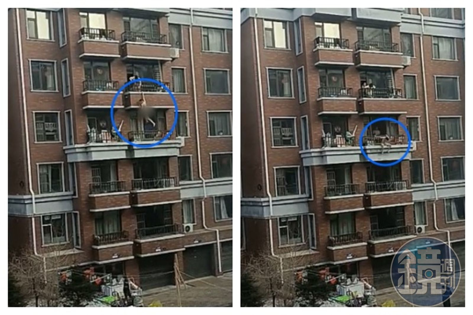 網路瘋傳的影片顯示,全身赤裸的男子試圖從5樓陽台往4樓攀爬,過程中1名白衣女子因擔心男子的安危,拚命拉著他的手,直到男子抓住陽台的邊緣才放手。男子抓住陽台邊緣後,試圖要踩踏4樓陽台的欄杆,但雙腳在半空中掙扎多次後,才終於踩到4樓陽台的欄杆。