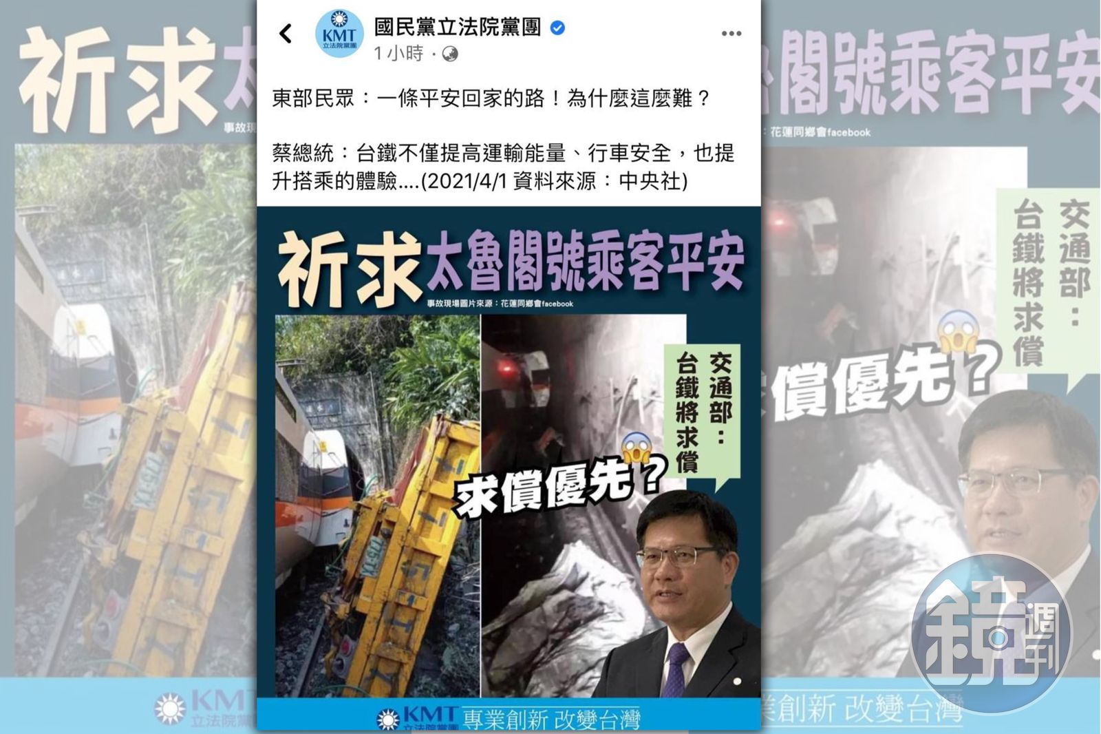 台鐵太魯閣號發生出軌意外後,國民黨立法院黨團於臉書貼出事故照片,祈求太魯閣號乘客平安,同時酸總統蔡英文近日開箱台鐵新車表示「台鐵不僅要提高運輸能量、行車安全,也提升搭乘的體驗」,再諷交通部長林佳龍表示台鐵將求償,質疑是否為「求償優先」?
