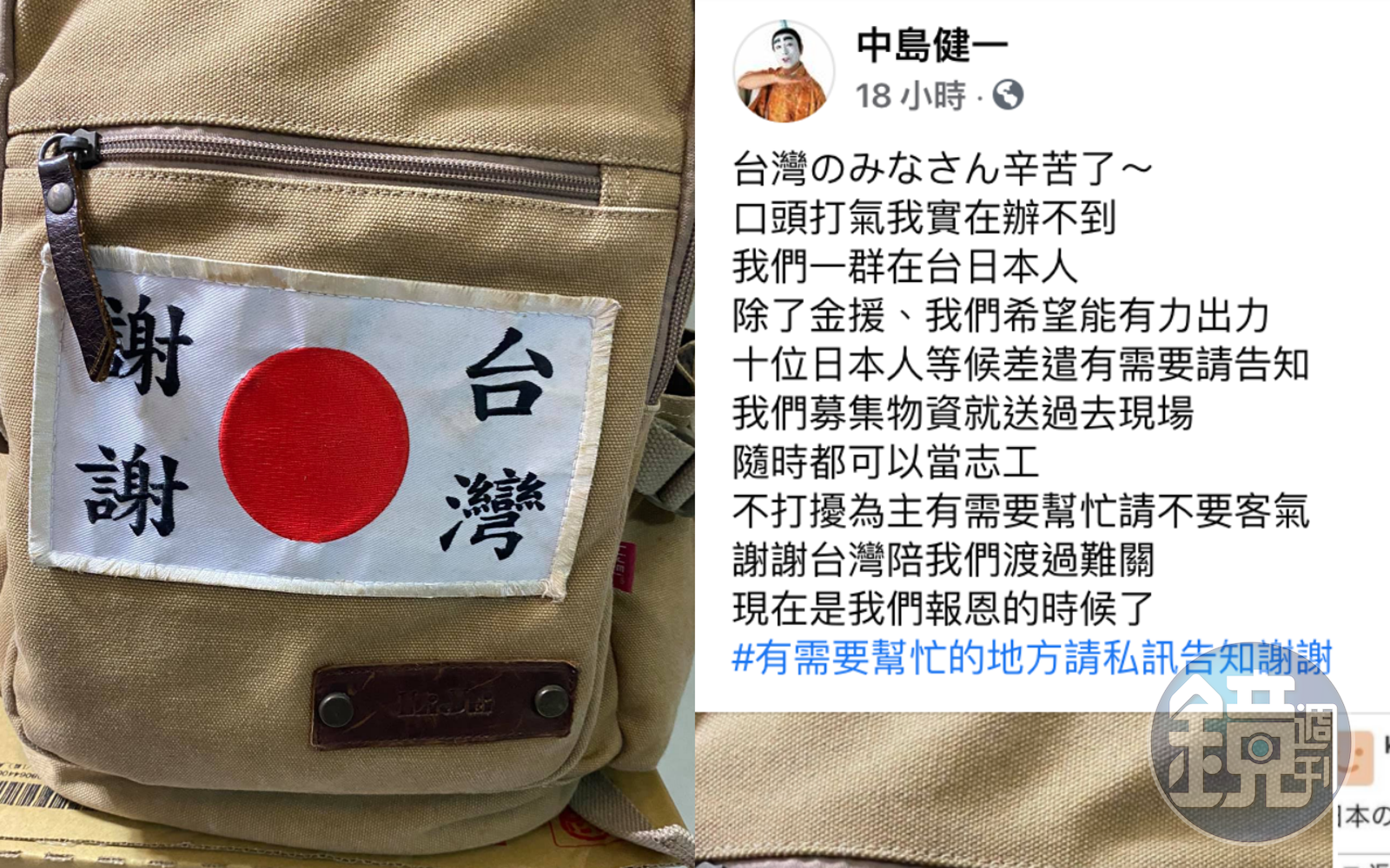 日本東北10年前發生大地震,隨後引發海嘯,造成嚴重傷亡,當時台灣大力幫助日本,讓日本人感念在心,時至今日仍有不少日本人對台灣表達感謝,一名在台日本人中島健一在臉書社團「日台交流広場(台湾と日本)」發文指出,「謝謝台灣陪我們度過難關,現在是我們報恩的時候了」,表示有10位在台日本人正等候差遣,有需要可以告知他們,他們會募集物資送過去現場,「隨時都可以當志工」。