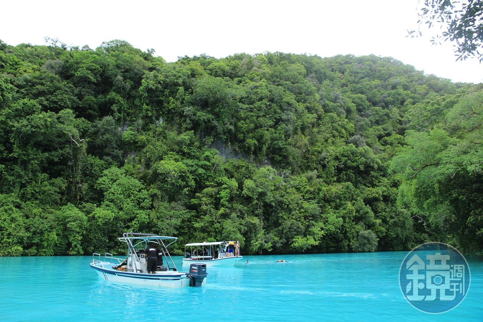 天氣晴朗多雲,船啟程了。從碼頭開始,帛琉的海從深轉淺,海面平靜如鏡,整個大海唯一移動的,似乎只有我們身處的這艘小船。行駛20分鐘後,抵達帛琉著名景點「牛奶湖」,船行穿繞過石灰岩島群,轉進擁有Tiffany藍的水面區域時,整區極為寧靜,只有一艘船來到這個宛若祕境的地方,那種極為幽靜的氣氛,如果不是帛琉泡泡,怎麼可能體會得到?