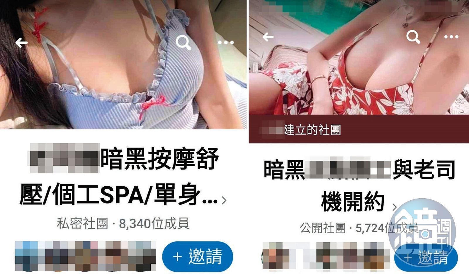 本刊調查,包括「個人工作室SPA優推薦」「全台個人油壓按摩、推拿、單親、紓壓交流」「老司機暗黑紓壓按摩個工SPA單身男女約會交流群」「包養象牙塔」……等十幾個社團,根本是仲介性交易的平台。
