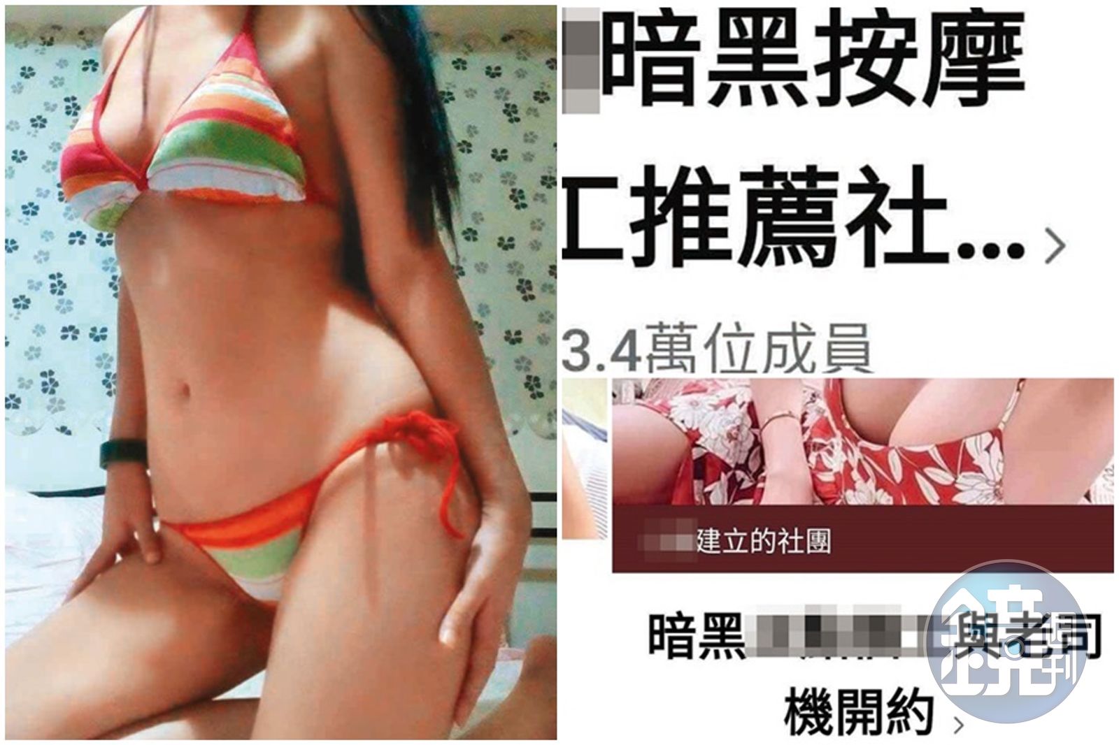 本刊調查,臉書上與情色有關的社團包括「個人工作室SPA優推薦」「全台個人油壓按摩、推拿、單親、紓壓交流」「老司機暗黑紓壓按摩個工SPA單身男女約會交流群」「包養象牙塔」「台灣南北按摩交流」「捷克論壇深夜區2.0」等,有些社團還分北、中、南不同版,以利業者就近招攬嫖客。