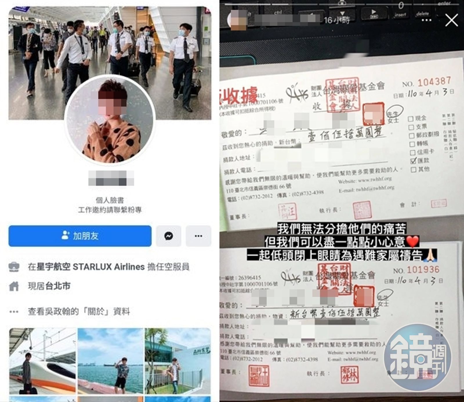 根據PTT網友爆料,這名吳姓網紅昨(4日)晚間貼出捐款150萬消息,上面不但簽名蓋章,還寫下「我們無法分擔他們的痛苦,但我們可以盡一點小小心意,一起低頭閉上眼睛為遇難家屬禱告」,疑似善舉背後卻遭揭作假,涉嫌下載網路舊圖加工竄改,連編號都一樣,企圖蹭熱度,引發民眾反感。