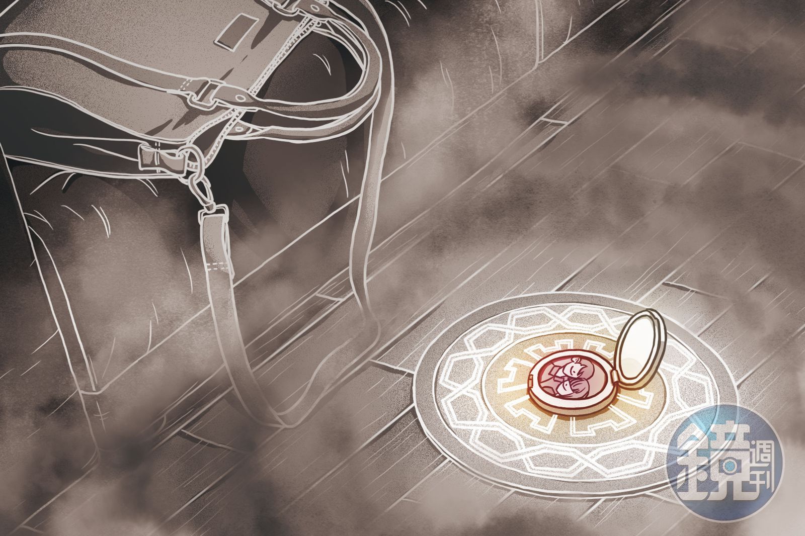 她負責的是沙發旁的「遺憾機關」。三年前,當蘇慧旻在此處遭受暴力脅迫時,她的隨身皮包遺落在沙發上,有一個貼有與陳胤竹合照的小化妝圓鏡,就掉落在旁邊地面上。沙發旁牆壁上有著滾滾黑流,不斷朝這兒流淌。