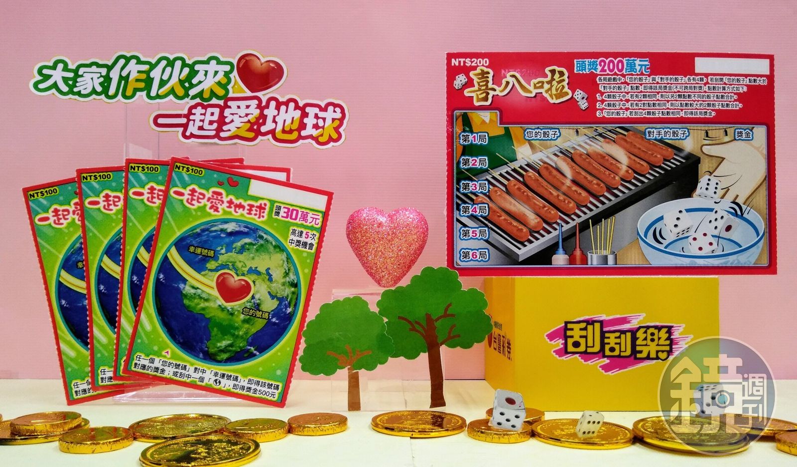 刮刮樂「一起愛地球」每張售價100元,玩法簡單又有趣,只要任一個「您的號碼」對中「幸運號碼」即可得該號碼對應的獎金,或是刮出一個「地球」符號即得獎金500元,共有5次中獎機會,3個頭獎30萬元,總中獎率33%。此外,台灣彩券發行的刮刮樂印製過程均通過國際環境管理ISO 14001標準認證,採用可回收與生物分解的紙張印製,印製顏料與刮漆皆不含有害化學物質,以實際行動落實企業社會責任,為環保盡一份心力。
