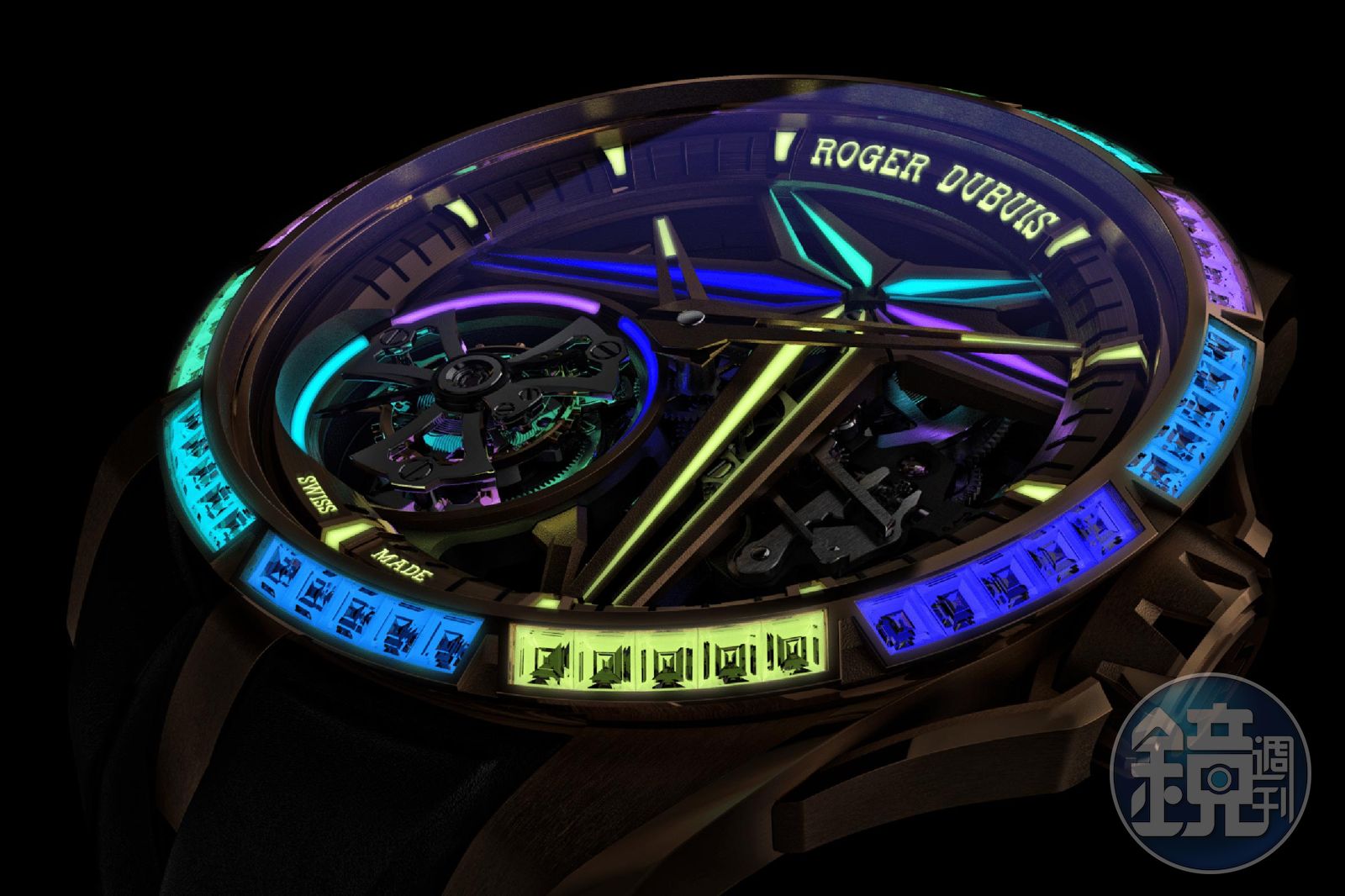 羅杰杜彼幾年前開始強調光影與色彩的變化,像是2019年的Excalibur Blackligh,鑲嵌起彩色寶石,2020年更在手錶裡頭加入放射狀藍寶石水晶管束,讓手錶在夜間呈現出猶如霓虹燈的絢爛效果。至於今年羅杰杜彼則是在上述介紹的Excalibur 王者系列飛行陀飛輪腕錶為基礎下,推出一款更限量的Excalibur Glow Me Up腕錶,白天時,是一款「純鑲鑽」的版本,然而一到夜晚,彷彿瞬間換上霓虹燈一般,帶來璀璨繽紛的光影變化!