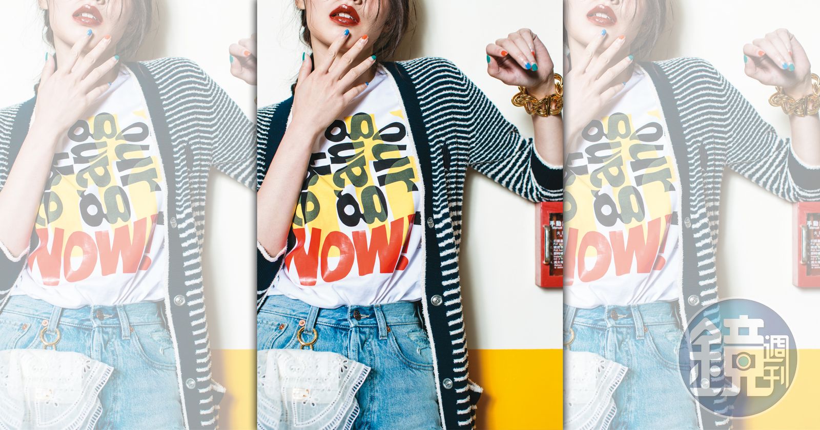 英文字母印花粉紅T恤 NT$19,500 by GUCCI;鏤空高領上衣 NT$43,000 by PRADA;黑色小羊皮格紋短褲 NT$99,000 by CELINE;Multicolor棉質長襪 NT$6,200 by GUCCI;湖水綠PVC鑽釦拖鞋 NT$46,300 by Roger Vivier;GG Logo織紋貝雷帽 NT$18,500 by GUCCI;Maillon Triomphe金色手環 價格店洽 by CELINE;Camarat金色手環 NT$24,500 by CELINE;粉色網狀Basket手提袋 NT$28,500 by FENDI。
