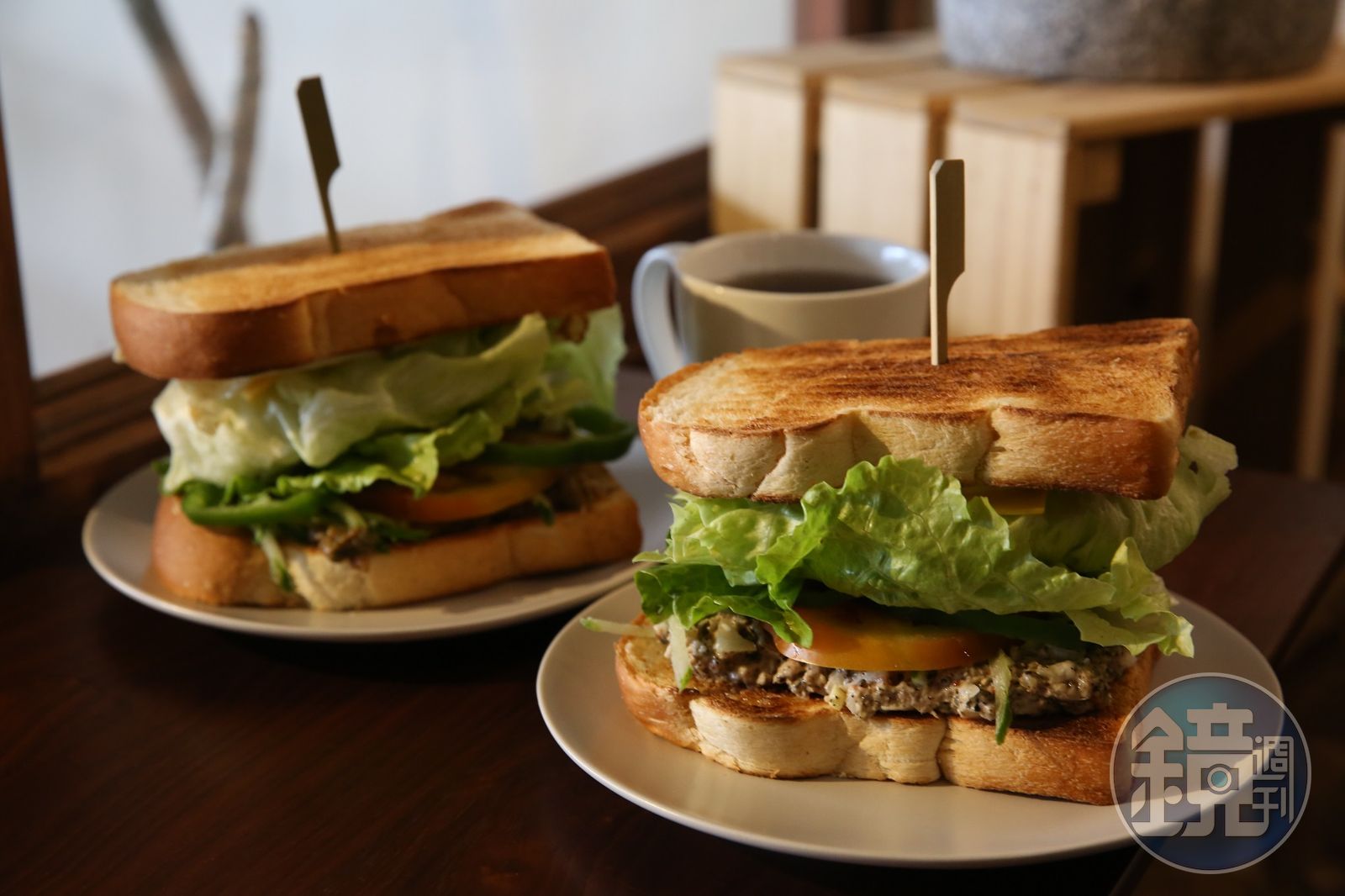 有趣的是,這兒的餐點重點在於高度,菜與肉、蛋層層堆疊,視覺感豐富。一款「皮蛋肉鬆起士蛋三明治」將皮蛋打碎成泥後搭配肉鬆,一口咬下可以嘗到麵包的鬆軟香氣,配上濃稠的皮蛋醬汁,獨特卻恰到好處。「秘製鮪魚起士蛋三明治」裡頭以芥末子醬和酸黃瓜增加口感,配上爽口的蔬菜,也非常迷人。