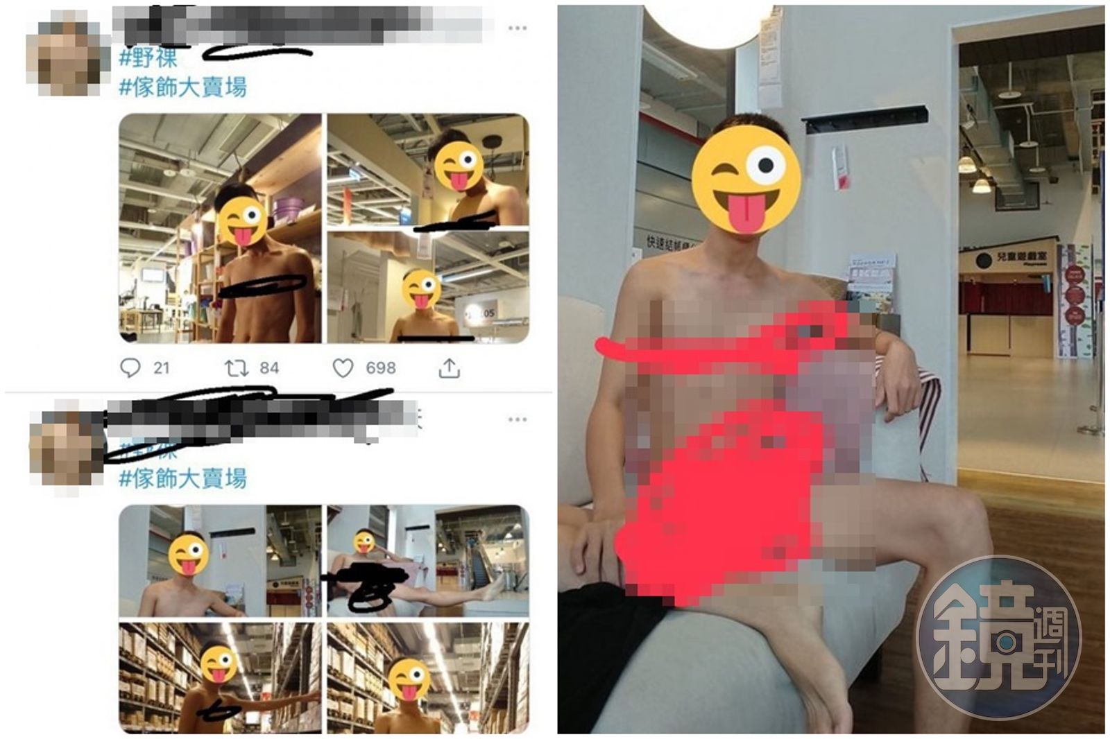 該網友匿名發文,直指不知道是哪間賣場,但看地點推測「這很明顯是ikea吧」,並表示該後方便是兒童遊戲室,認為在公共場合全裸拍攝不雅照「有夠噁」。據網友貼出照片來看,男子豪邁一連7張將掰腿照放在Twitter供人觀賞,畫面相當不雅。