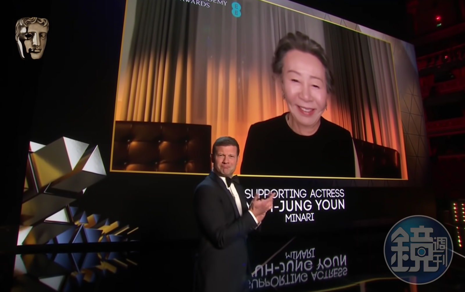 73歲的尹汝貞聽到自己得獎時,露出驚喜不敢置信的神情,「哇~」了一聲才開始講感言,「我是韓國女演員尹汝貞,我不知道說什麼...我非常榮幸獲得提名,啊不不不,我獲獎了。首先容我先向愛丁堡公爵表達深切的哀悼,謝謝能得到這個獎,每個獎都非常有意義,但能得到以『勢利眼』聞名的英國人認可,這更加有意義了,他們認可了我是個好演員,所以我感到非常榮幸與開心,謝謝你們,謝謝投票給我的大家。」致詞完的她還做了一個俏皮的鬼臉,贏得了滿堂彩。