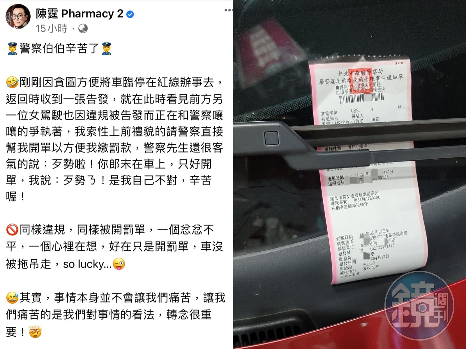 陳霆自曝違規停車遭開單,見另一名違停車主與警方爭吵,大嘆警察真辛苦。(翻攝自陳霆臉書)發布時間:2021.04.13 12:56 臺北時間