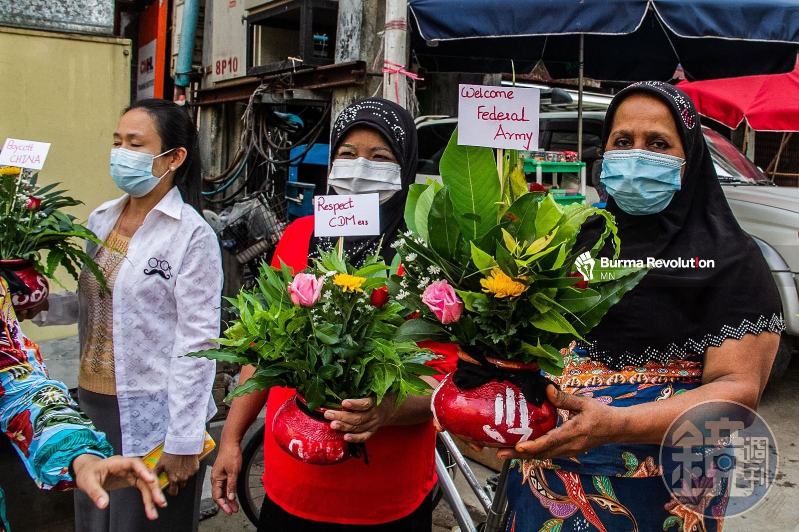 週二潑水節開跑,在緬甸許多城市登場的卻是抗議軍政府的示威行動,民眾拿著裝有鮮花的傳統陶罐,寫下「拯救緬甸」「保護民主」「為民主而戰」等字句,據示威者表示,這些陶罐一方面是為了迎接新年,一方面是象徵紀念那些殞落的英雄。還有人在這些陶罐上,畫上了代表緬甸示威行動的「三指禮」的圖案,致敬所有勇敢反抗軍政府暴行的人民。