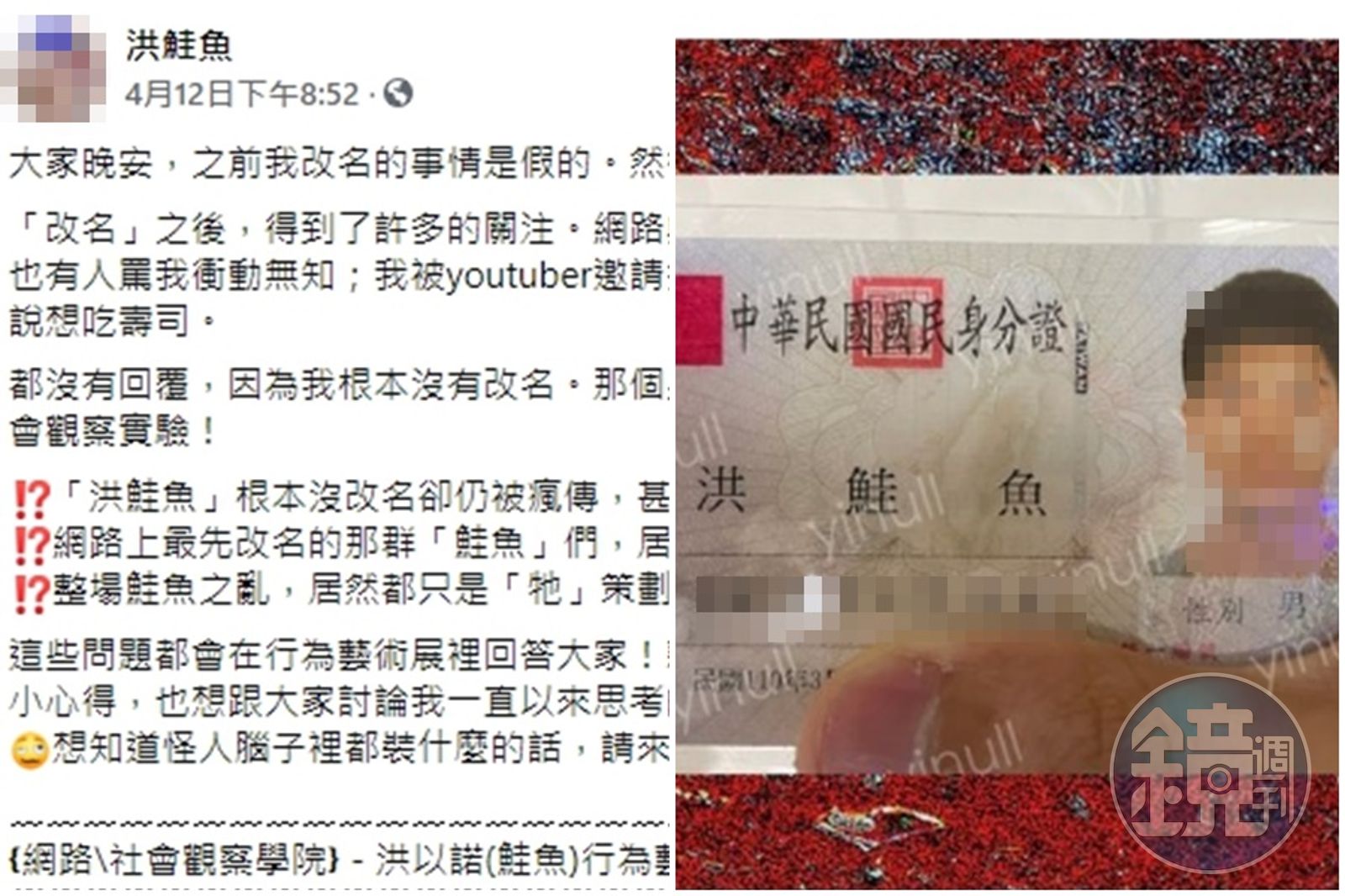洪鮭魚本月12日在臉書公開貼文,自曝「我根本沒有改名」,只是透過P圖來進行實驗,根據《ETtoday》報導,洪男表示改名是騙人的,卻還登上波士頓郵報(應為華盛頓郵報),解釋此舉是希望透過修圖、假貼文來觀察網路、社會生態,同時在臉書公告表示,將在16日至19日舉辦個人行為藝術展,「向大家揭發這個騙局。」