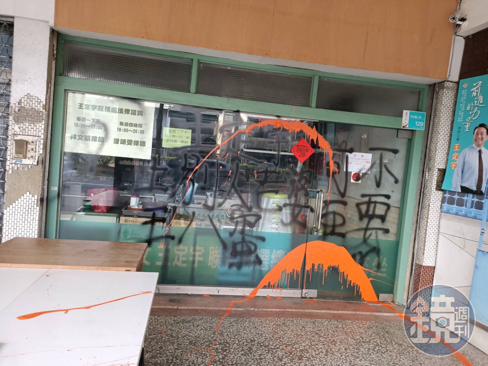立委王定宇位於台南的2個服務處今遭人潑漆,犯案者還分別噴上「X人妻很爽嗎,可惡…」「上別人老婆,王八蛋」等不雅文字,警方先前獲報趕往現場了解,但服務處方面並未多做說明。