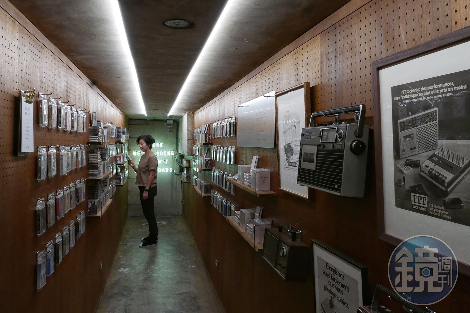 離開前,別忘了走進與感傷唱片行合作的地下室卡帶選物空間,卡帶價格依照不同顏色,從100、150、200至500元的卡帶皆有,包含中文與西洋卡帶,從李宗盛、張國榮到小虎隊等歌手的經典曲目,以及牆壁上展示的卡帶收音機,回想起今日在我的隨身聽裡,播放的東方快車的懷舊歌曲,看著眼前小小的地下室,頓時像是搭上時光機,回到3、40年前的美好年代。