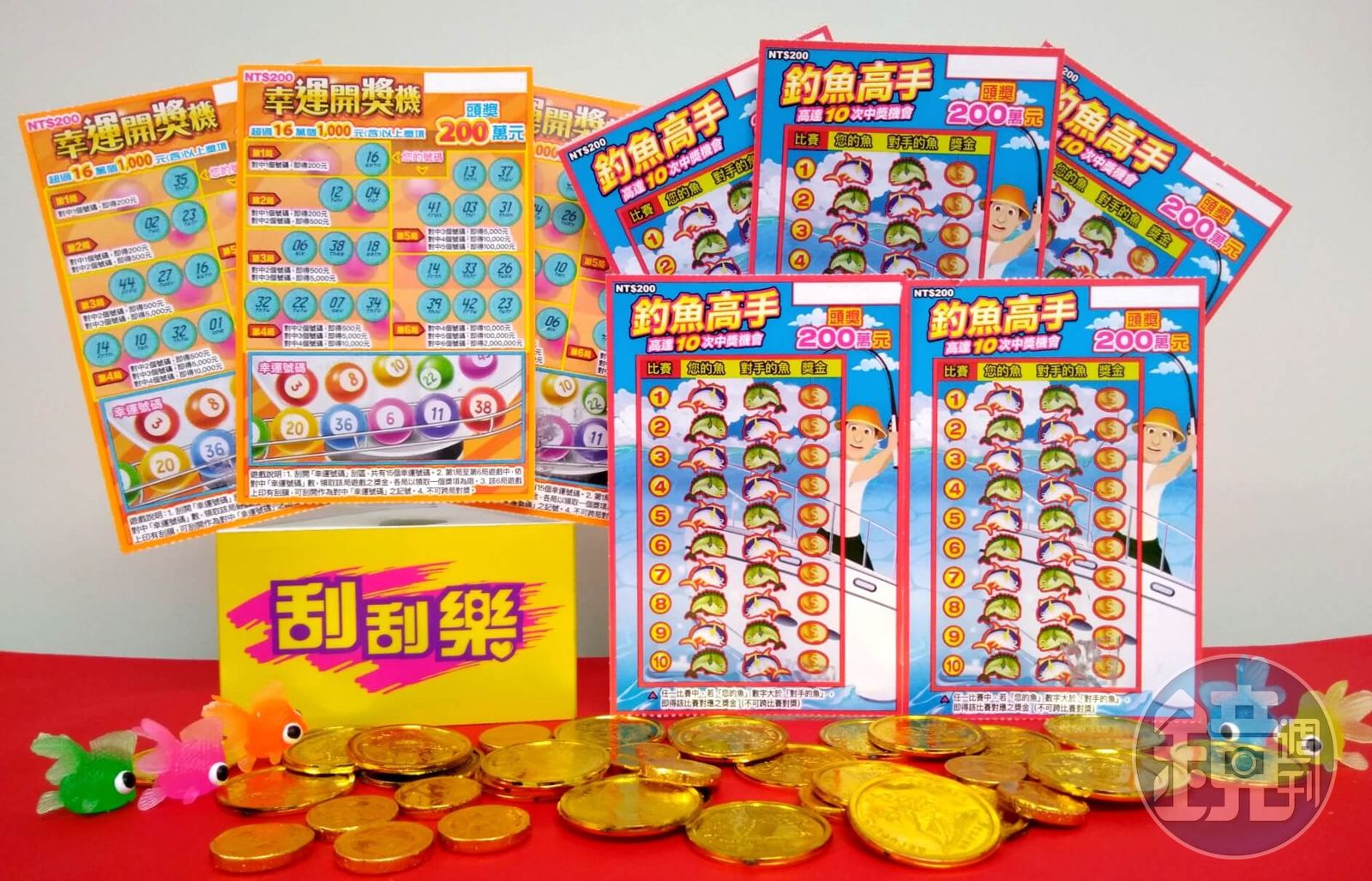 台彩指出,「釣魚高手」每張售價200元,票面以奮力拋出釣桿、蓄勢待發的釣客,搭配遊戲刮區生動的魚隻和耀眼金幣,充分展現紙上海釣競技、高手過招的樂趣與刺激;「釣魚高手」共規劃10局的「比大小」玩法,等於有多達10次的中獎機會,相當適合新手嚐鮮體驗。消費者在任一局比賽中,若刮出「您的魚」的數字大於「對手的魚」的數字,即可獲得該局「獎金」刮出對應之中獎金額。「釣魚高手」頭獎200萬元共有4個,1,000元(含)以上獎項超過16萬個,總中獎率33.01%。