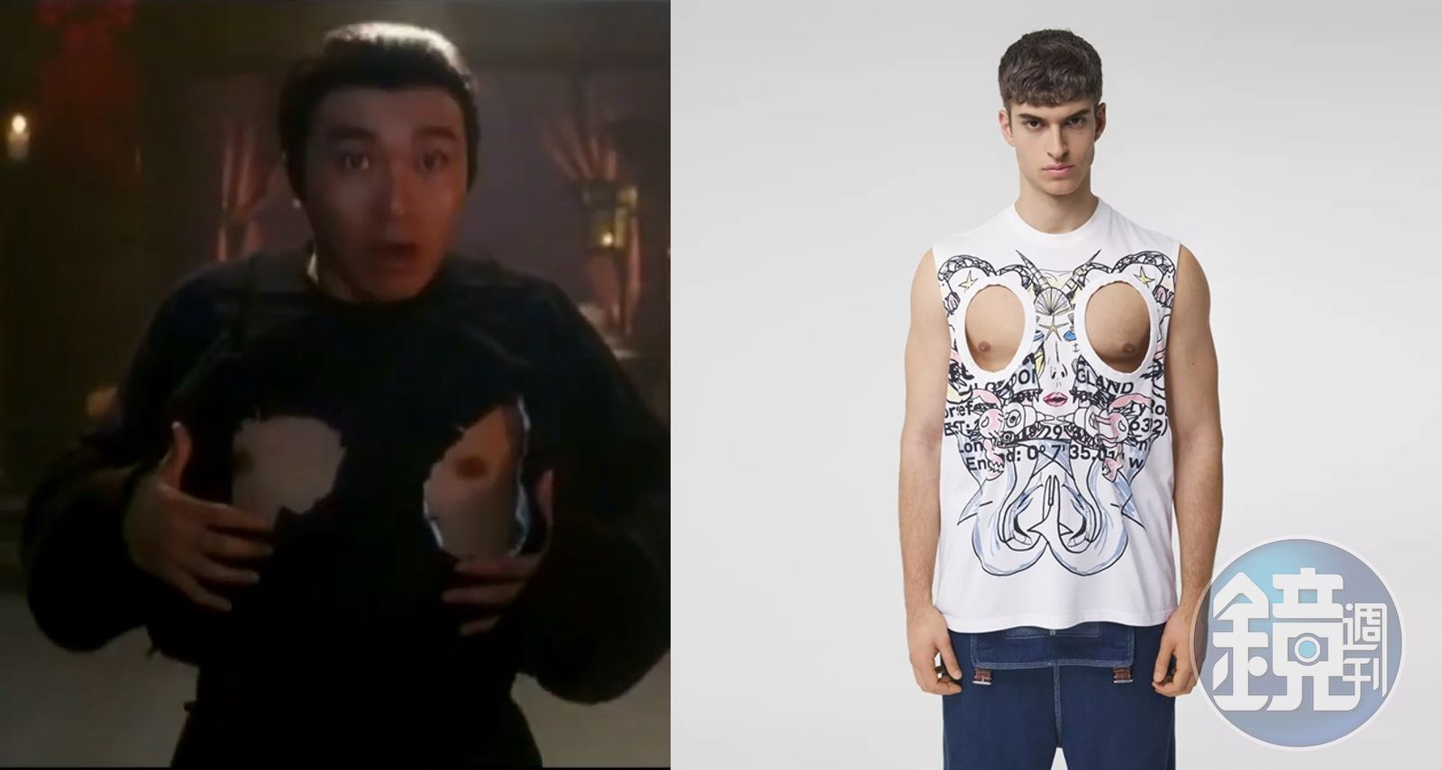 其實去年12月就有網友發現Burberry一款T恤就是胸前挖洞設計,並稱靈感疑似來自周星馳的《鹿鼎記》,另一款無袖背心也是相同設計,再度引起網友熱議。不過若是資深港片迷,應該會記得早在《鹿鼎記》上映前3年,也就是1989年另一部描述香港女特警的動作喜劇《神勇飛虎霸王花》中,90年代的「香江波神」葉子楣就穿了挖胸的防彈衣。