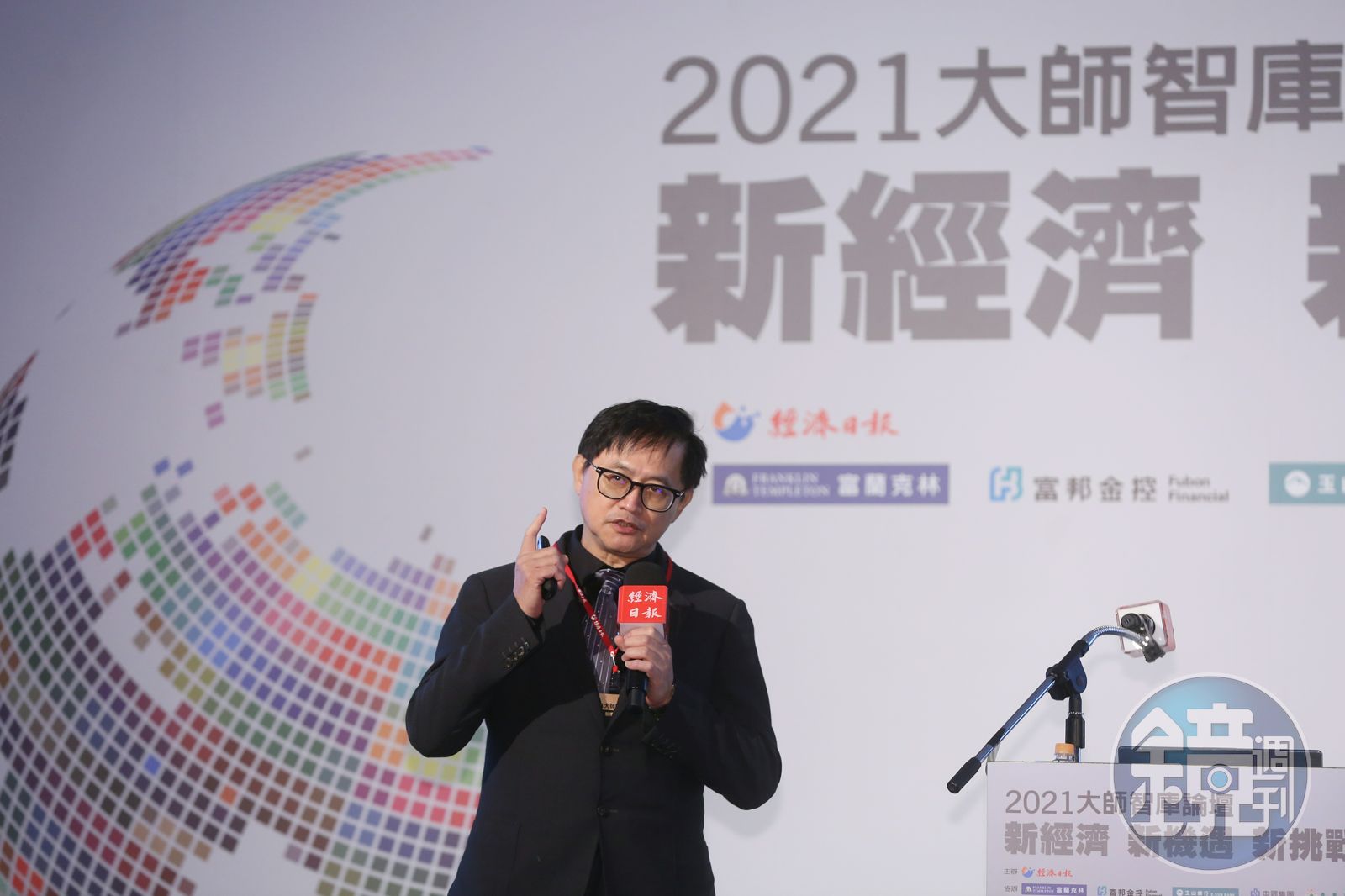 他還舉了中鋼股價暴漲為例,「最近中鋼股價暴漲,大家看到了嗎?就是因為鋼鐵也缺,缺料情況顯示出產業非常蓬勃,這是經濟學的矛盾,一個東西太快樂的時候,經濟發展帶來通貨膨脹,大家畫漫畫的時候,會把通貨膨脹畫成一個恐龍、怪獸,但是相對的,如果不膨脹、而是通貨收縮,這樣好不好呢?如果通貨膨脹是一個恐龍,那通縮就是三頭恐龍。」