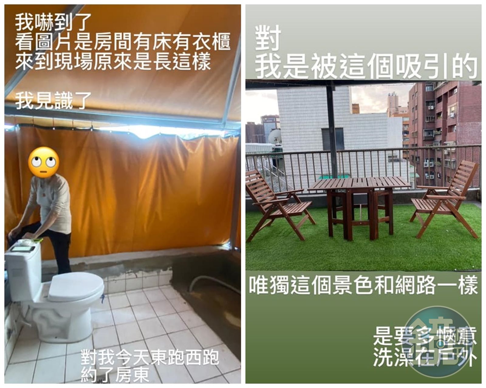 昨(20日)臉書粉專「奇葩裝潢分享中心」分享一名女大生的看屋的荒謬經歷,照片中顯示,這間戶外的浴廁沒有牆壁,只是很簡易的搭上棚架跟帆布,隔出一個洗澡空間,帆布接縫處明顯透光漏風,格局相當簡陋,並寫道「我真的嚇到了,雖然我也漸漸想成為outdoor人,但也不是這樣吧」。