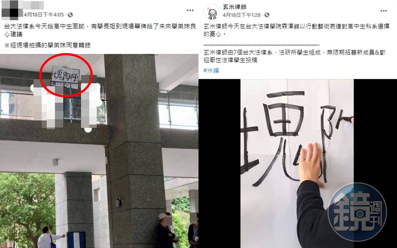 事實上,舉牌的人正是由台大法律系、法研所學生組成的社團「玄米律師」的社員,他們稱這是「以行動藝術表達對高中生科系選擇的憂心。」並寫下2篇長文〈高中生,為什麼你不該讀法律系〉及〈我適合念法律系嗎?〉