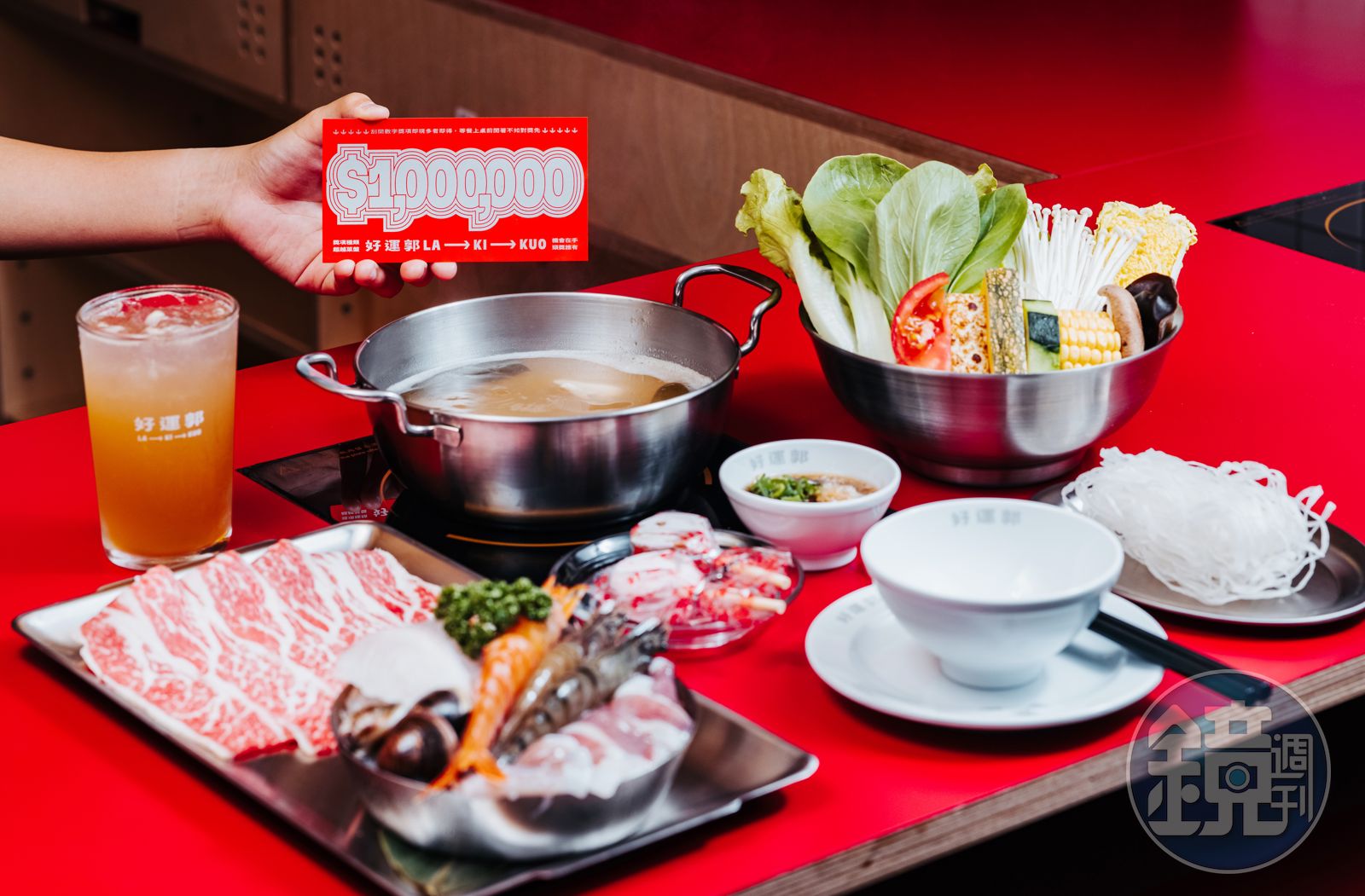 不過,吃鍋是要怎麼幸運啦?沒想到,Ethan非常認真看待幸運這件事,還把幸運分成兩個層次(?!)首先,每鍋點餐後會送你印上「$1,000,000」的刮刮卡,當然不可能送你一百萬現金,但刮開確實有獎(品),集滿重複的「菜」「肉」或「特」,就能加菜、加肉肉,or加一個神秘的小禮物,為了不要被討厭,先不破哏,這是第1個層次的幸運,是小幸運。
