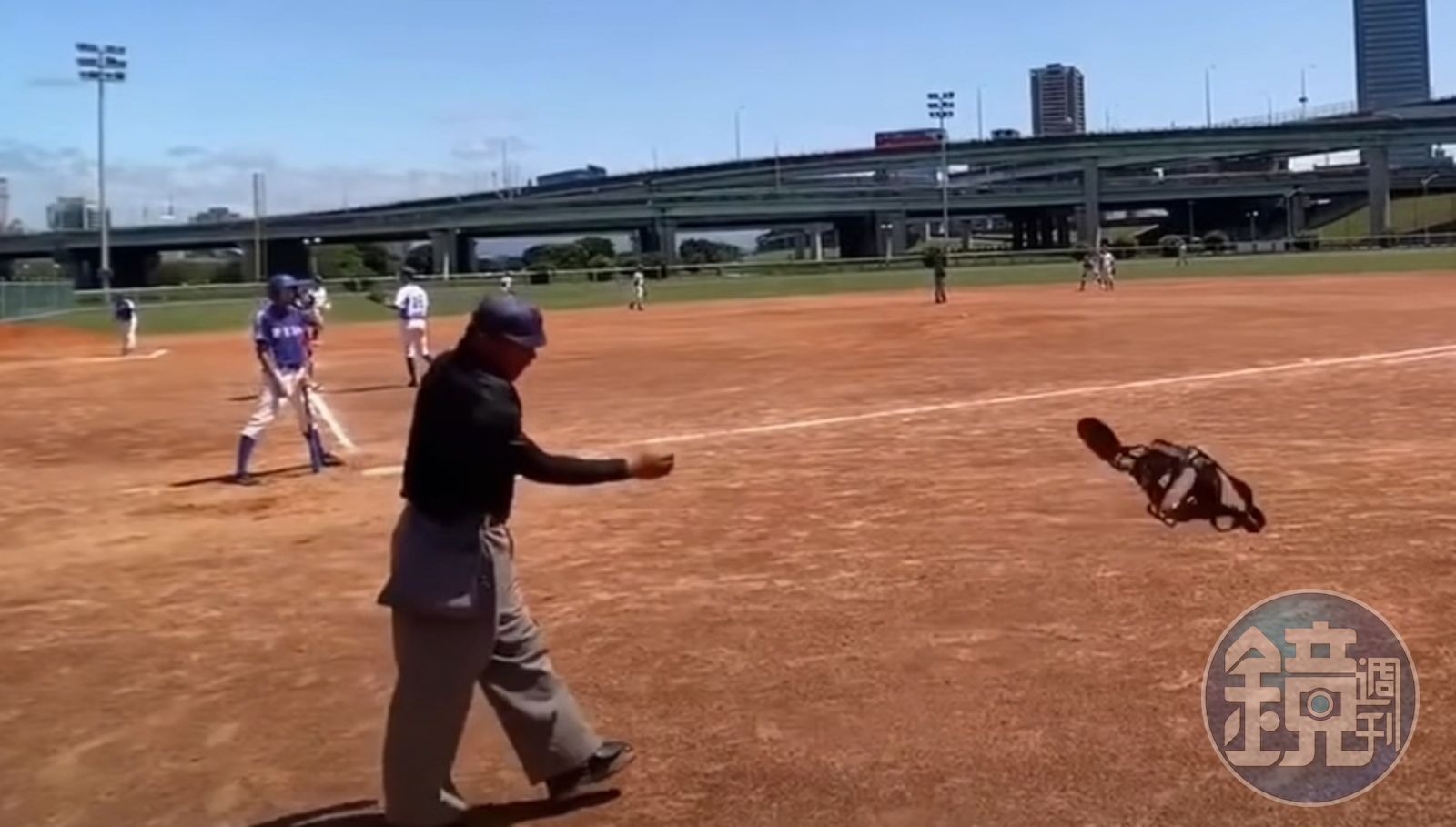 當時比賽由新莊高中以10比1領先板橋高中,5局上板橋高中投手投出一顆地瓜球,捕手因漏接導致失投球彈地後擊中主審手肘,主審當場摔下面罩走到一旁彎下腰,扶著遭球吻的左手肘,神情相當痛苦。
