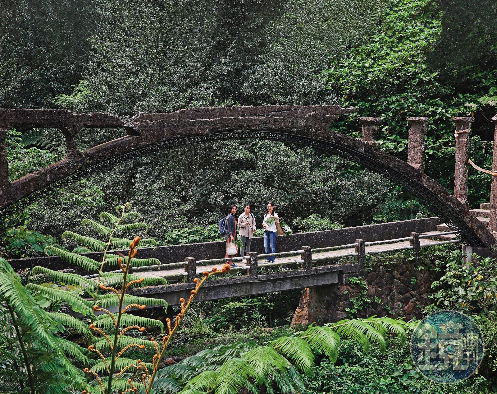 跟著老師走上民宿周邊可以「拈花惹草」的步道,「插花除了有鮮花當主角,配角也很重要。」施妙宜提醒大夥剪下路邊茂盛的蕨類,沒多久又相中綠蔭濃密的老榕樹,「可別小看這些榕樹氣根,它可是製作花圈骨架的好素材。」最後還來到水圳橋駐足賞景。