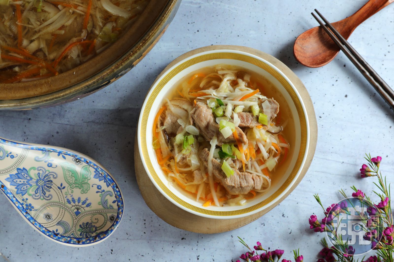 Step3:爆香紅蔥頭,放入切絲的各種蔬菜,放入已煮好的排骨湯,加鹽、醬油、芥末胡椒鹽與醋調味,湯滾煨熟食材。