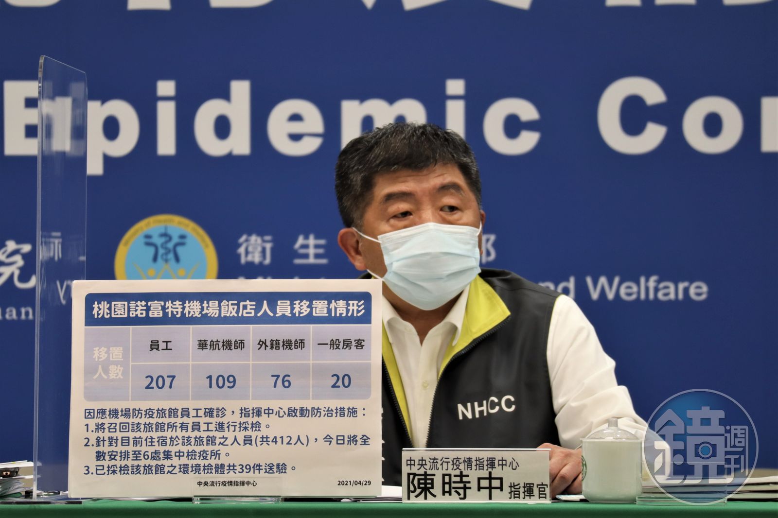指揮中心表示,案1120為本國籍40多歲男性的機場防疫旅館員工,近期無出國史,平時工作項目為檢查房間環境之清潔,協助機組員購買物品或送備品,工作期間皆有佩戴口罩及手套。