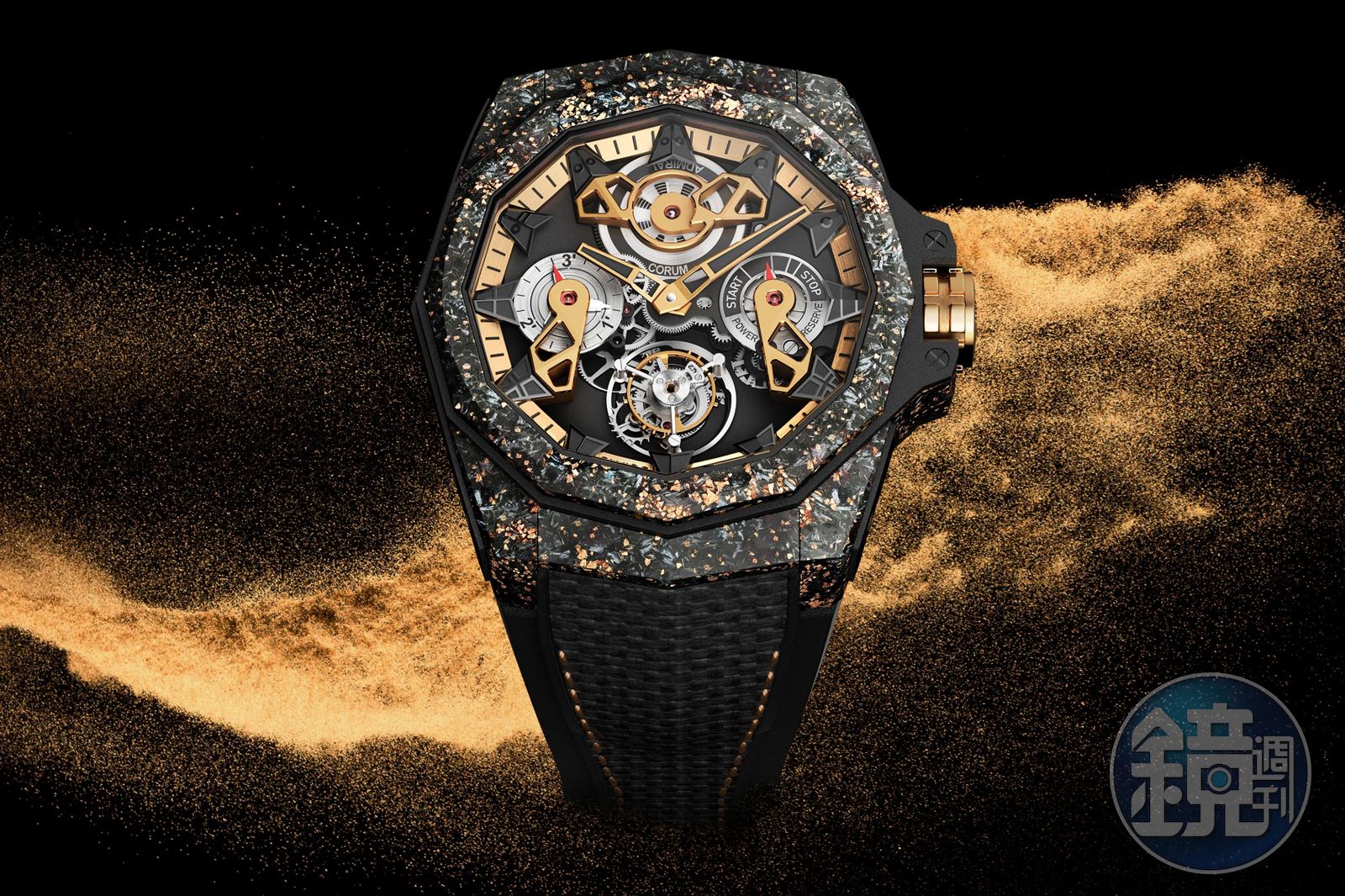 海軍上將飛行陀飛輪鏤空自動腕錶是崑崙錶在2019年發表的款式,它搭載了CO 298 自動飛行陀飛輪機芯,通透的機芯結構,板路延續到外側的海事旗裝飾,整個空間的層次感與三維空間相當立體;而2020年推出彩色海事旗的版本之後,今年崑崙表改以材質為賣點,採用碳與玫瑰金結合的複合材質來當作錶殼,因為玫瑰金的金在碳材質的上呈現不規則形狀,因此在每一款作品都有不同的表現。