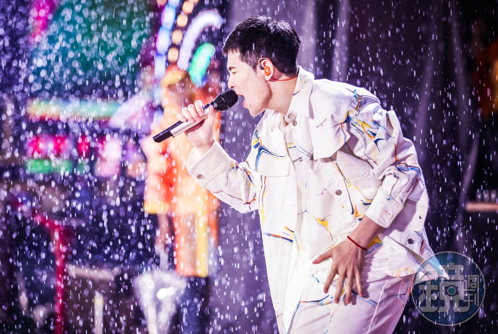 演出現場大雨滂沱,蕭敬騰沒有拿傘具,全身濕透。(喜鵲娛樂提供)演出現場大雨滂沱,蕭敬騰與台下粉絲一樣沒有拿傘具,還在雨中大跳「17N9舞」,老蕭滿場飛,到最後濕身也絲毫不減熱力,相當敬業。