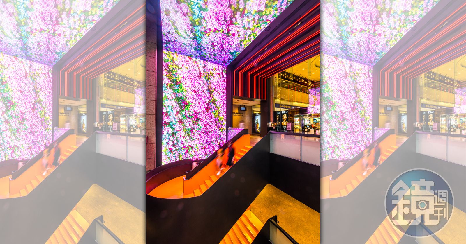 整個牆面延伸到天花板的螢幕,很難不吸引人注意。我好奇那個顏色的樓梯,走下去是不是愛馬仕的旗艦店?發布時間:2021.05.11 08:00 臺北時間