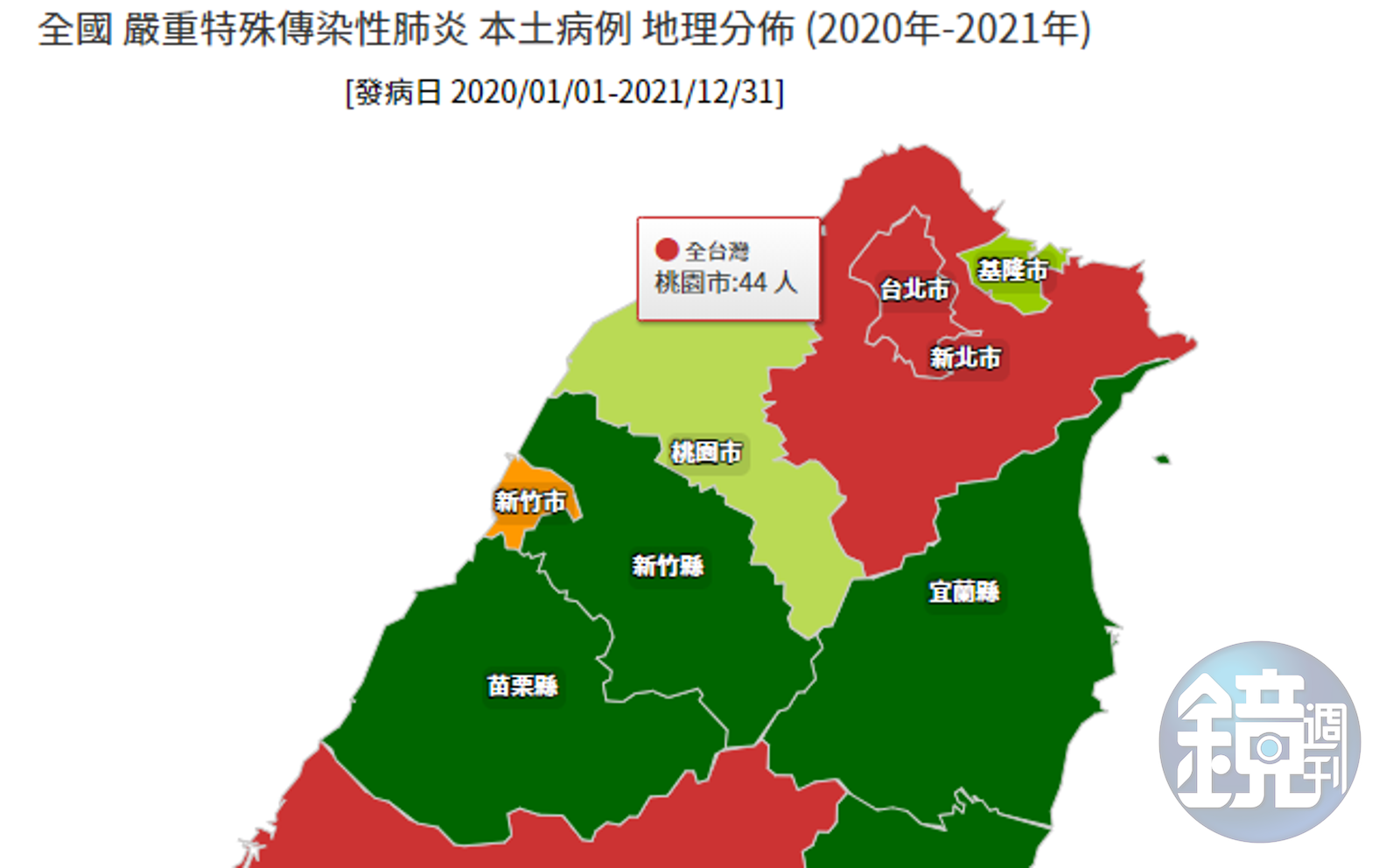 疾管署今日更新「本土病例地圖分布」,可見桃園市、新北市、台北市、台中市及彰化縣亮紅燈警報,分別染疫人數為桃園市44人、新北市24人、台北市11人、台中市5人及彰化縣4人;至於亮橘燈的新竹市有3人確診,而青綠色燈號的則包含基隆市1人、南投縣1人、台南市1人,全台截至今日已累計94例本土個案。