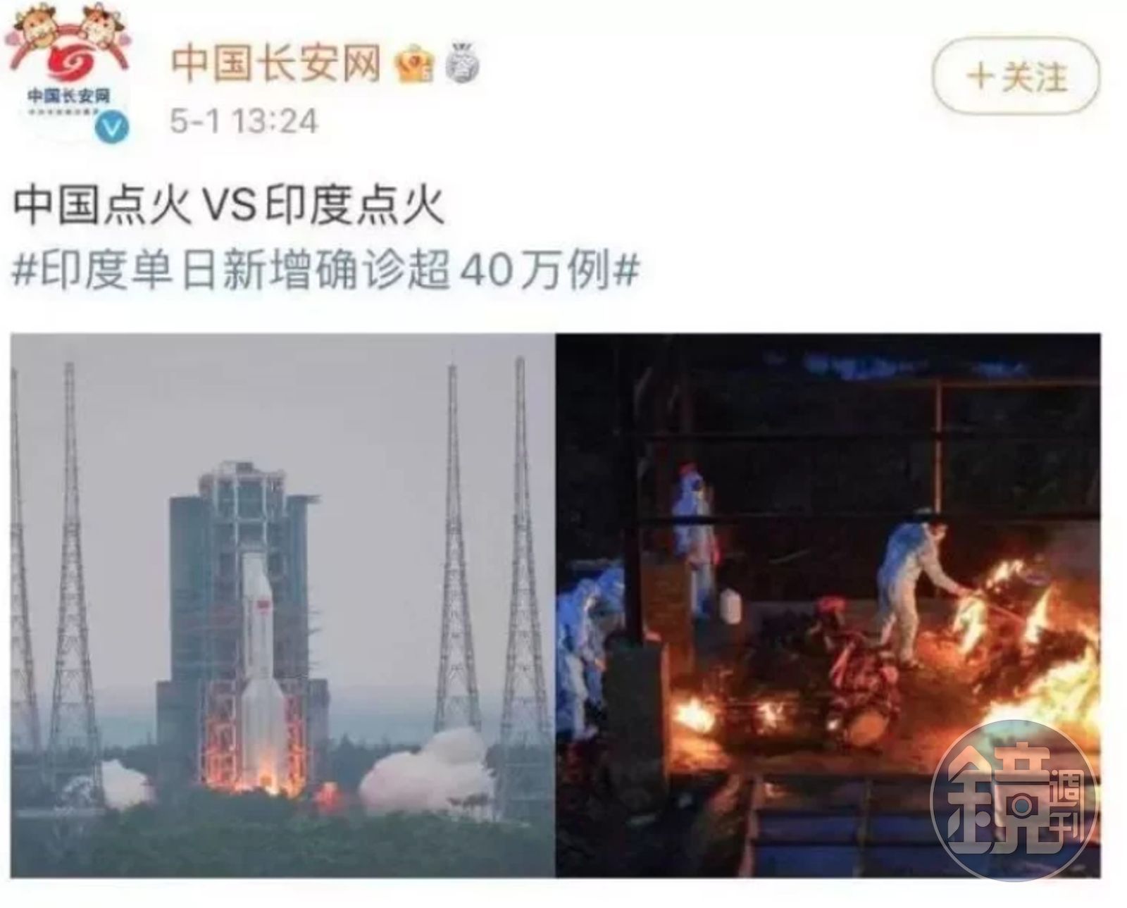 中國中央政法委官方微博「中國長安網」貼出一張合成圖,一張是中國發射火箭現場,一張是印度火化染疫亡者遺體照片,並寫下「中國點火VS印度點火 #印度單日新增確診40萬例」,此舉隨即引起各界反彈,該文章也於當日刪除。