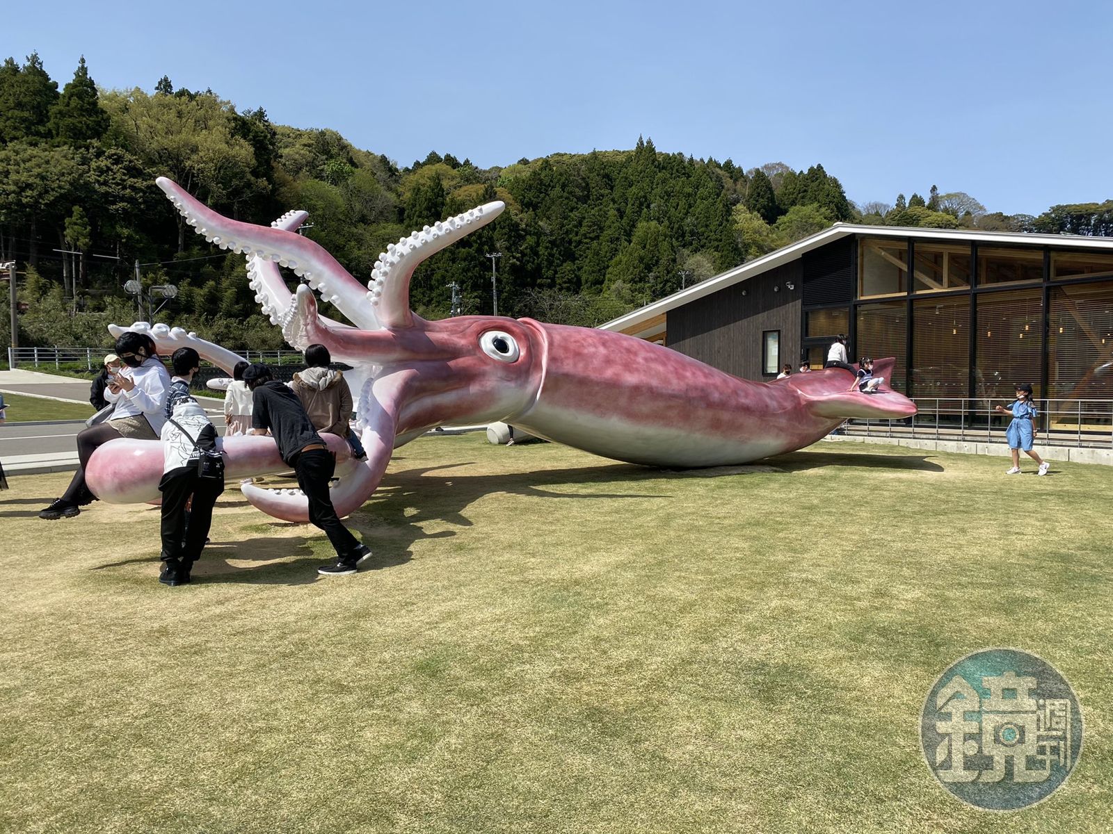 這隻超大魷魚長13公尺、寬9公尺、高4公尺,是用2,700萬日圓的防疫補助金打造出來的,就放在九十九彎附近的休息站前當成地標,當地官員指出,因為魷魚是當地特產,因此打造此地標,希望在疫情過後能吸引遊客來觀光,這座雕像在去年7月就決定製作,今年3月才正式安裝完成。