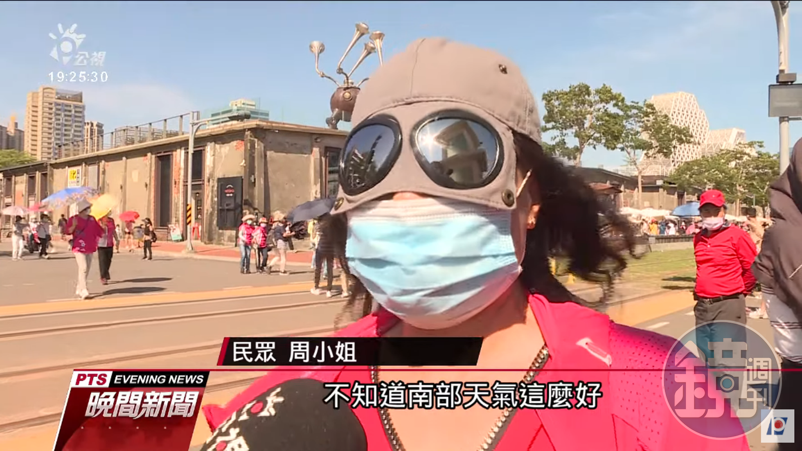 有一名婦人接受電視新聞採訪,奇特的造型意外受到鄉民關注。(翻攝自公視新聞網YouTube頻道)發布時間:2021.05.10 16:23 臺北時間