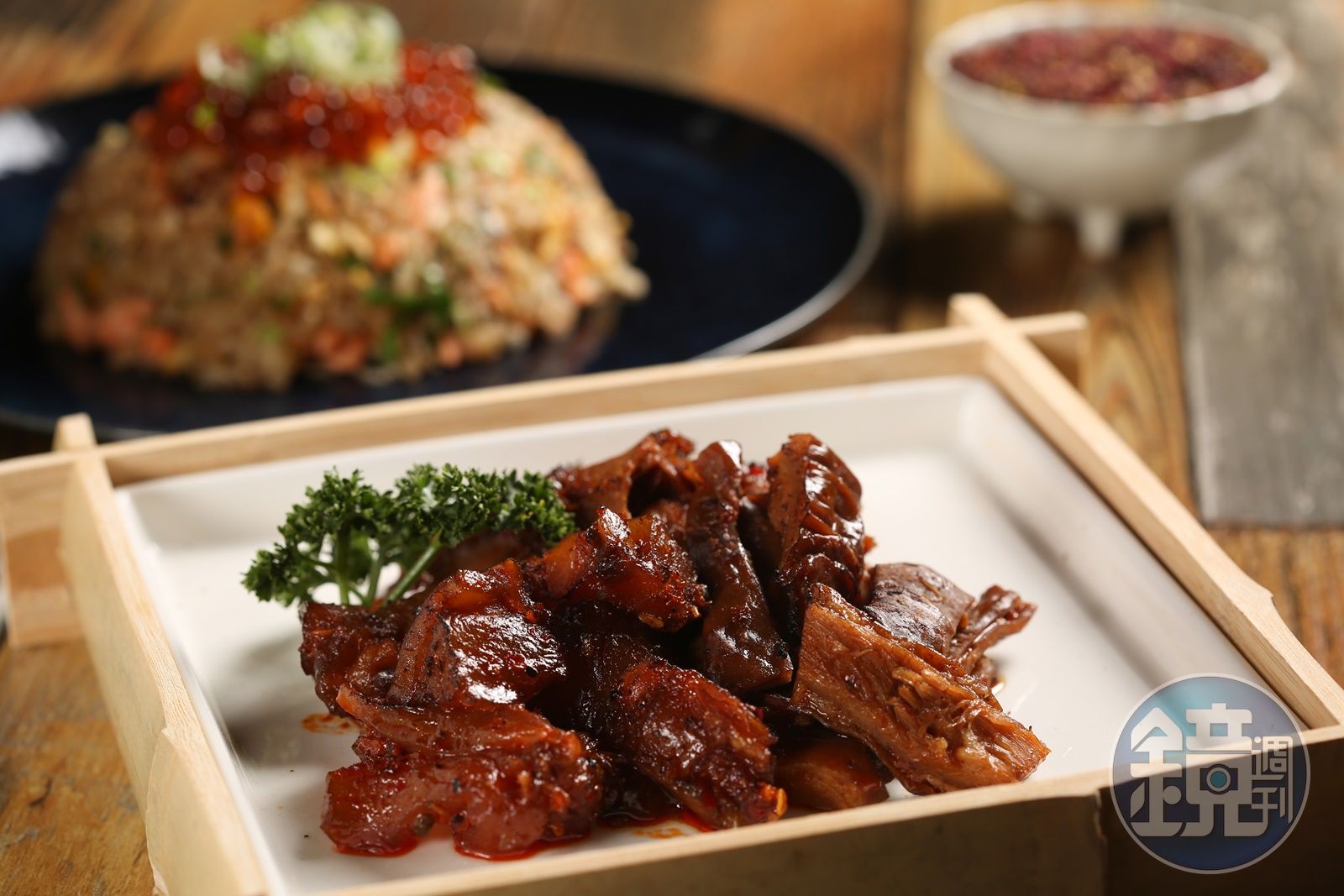 雖說做烤物,也沒偷懶省事,雞腿肉叫貨來,師傅會精修油脂、碎骨,自己調出味噌醬、明太子醬等,加上寬巷子老闆繼續神助攻,用其招牌湯底、貢布胡椒粉、雞油端出「貢布胡椒豬肚」火鍋,豬肉片仿照寬巷子擺成玫瑰花瓣,就有了一道特色菜,杜哥說:「這是寬巷子的簡單版。」一喝,濃郁胡椒暖脾胃,豬肚無雜味,保有嚼勁,寶哥得意地說:「國際大導演李安是開幕的第一位貴賓,他吃到這個鍋也覺得好吃。」