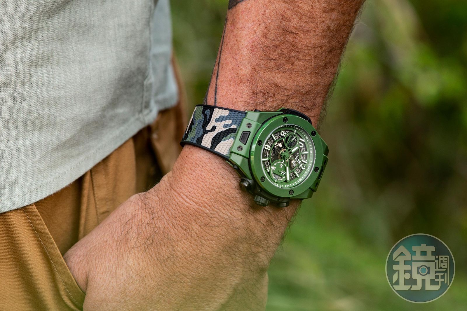 第二代Big Bang Unico SORAI限量錶,使用與前一版相同的計時碼錶款式,45mm陶瓷錶殼,裝載自製的HUB1242 自動上鏈機芯,動力儲存72小時。與第一代相同的設計元素還有9點鐘位置功能錶盤上,以幾何線條勾勒而出的犀牛圖案,相當討喜!透明藍寶石底蓋刻有特別限量版圖案,錶款搭配迷彩橡膠錶帶與綠色魔鬼氈錶帶,兩條錶帶展現不同個性。全新Big Bang Unico SORAI限量錶,全球限量100只,建議售價NT$749,000。