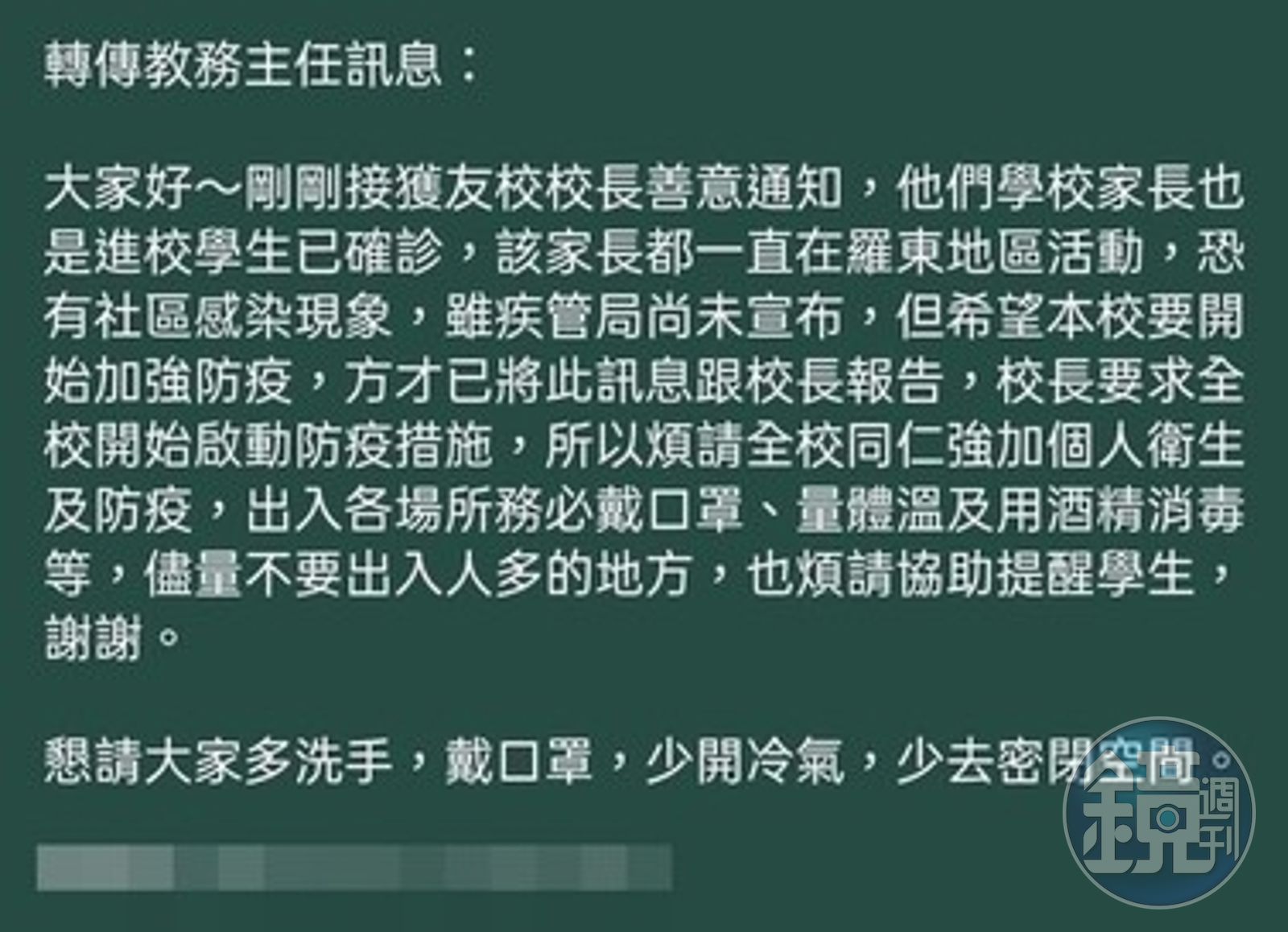 宜蘭某所高中今(11日)緊急發公告,表示校方接到通知,指有學生家長確診,且該名確診者平時都在羅東地區活動。(翻攝畫面)發布時間:2021.05.11 14:21 臺北時間